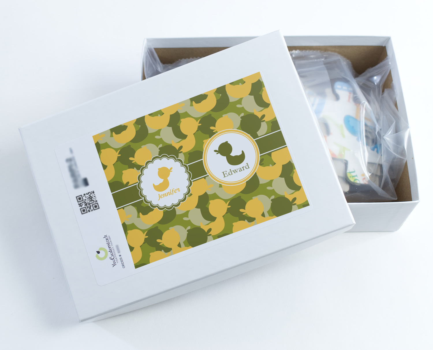 We chose to use a couples / twin personalization on our duck camo design. We used two labels - one is a girl round scalloped, while the second label is a simple round. We used the duck graphics from the camo pattern and used names below the graphics for personalization.