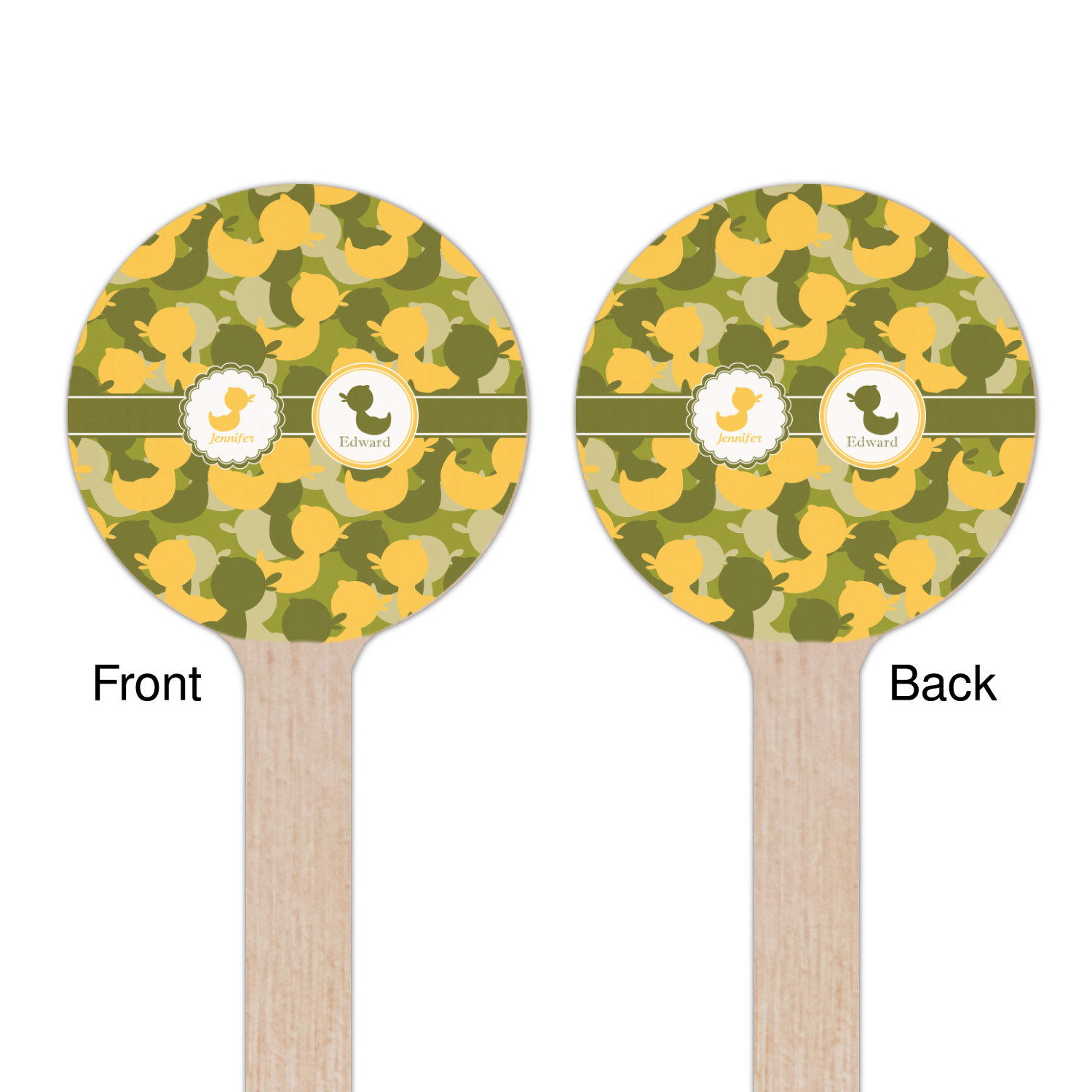 We chose to use a couples / twin personalization on our duck camo design. We used two labels - one is a girl round scalloped, while the second label is a simple round. We used the duck graphics from the camo pattern and used names below the graphics for personalization.