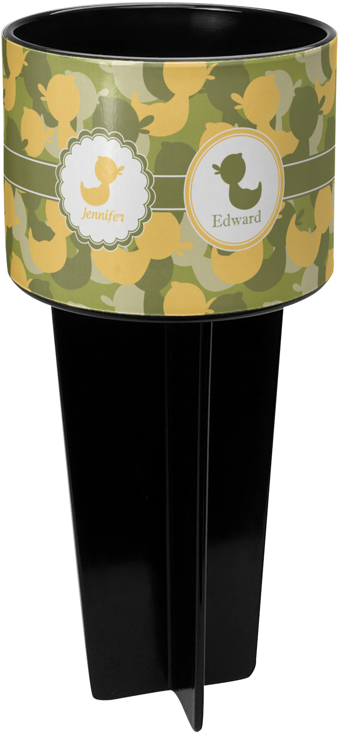 This cup holder has a large stake at its bottom that anchors it to the sand or ground below, while the cup holder rests above the stake. The entire drink holder is made of durable plastic and displays your customization around the cup holder portion. We sell these personalized beach spikers in two different colors: black and white.