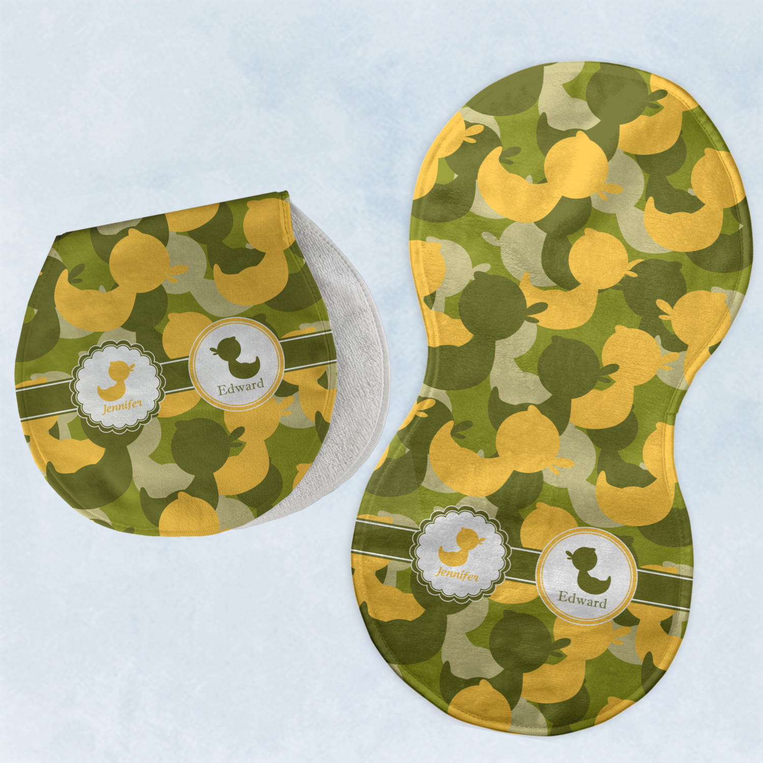 We chose to use a couples / twin personalization on our duck camo design. We used two labels - one is a girl round scalloped, while the second label is a simple round. We used the duck graphics from the camo pattern and used names below the graphics for personalization.