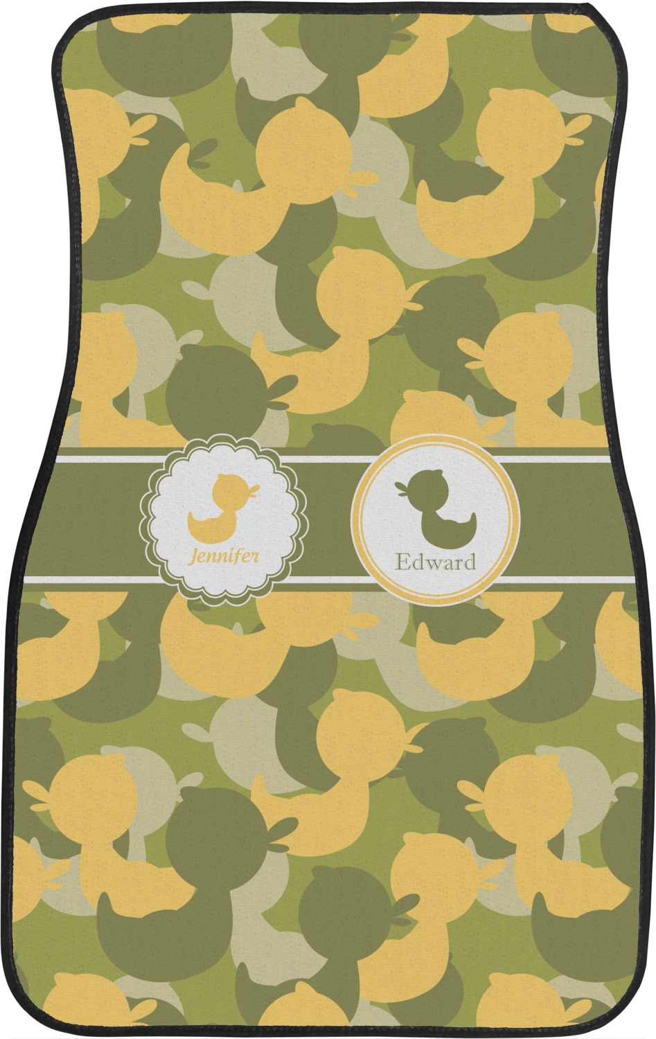 We chose to use a couples / twin personalization on our duck camo design. We used two labels - one is a girl round scalloped, while the second label is a simple round. We used the duck graphics from the camo pattern and used names below the graphics for personalization.