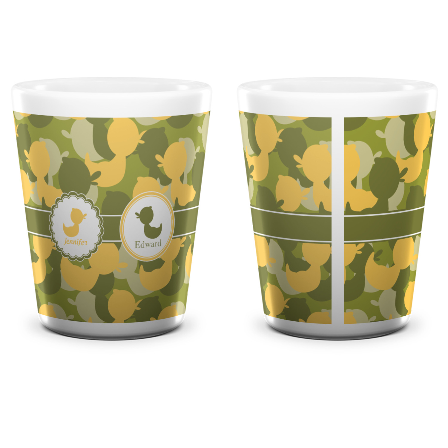 We chose to use a couples / twin personalization on our duck camo design. We used two labels - one is a girl round scalloped, while the second label is a simple round. We used the duck graphics from the camo pattern and used names below the graphics for personalization.