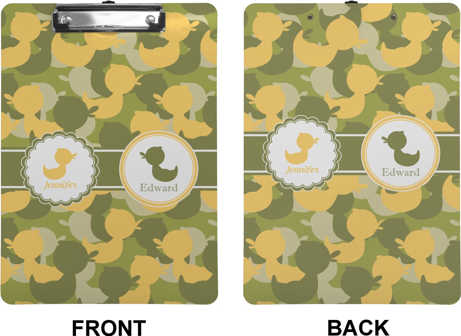 We chose to use a couples / twin personalization on our duck camo design. We used two labels - one is a girl round scalloped, while the second label is a simple round. We used the duck graphics from the camo pattern and used names below the graphics for personalization.