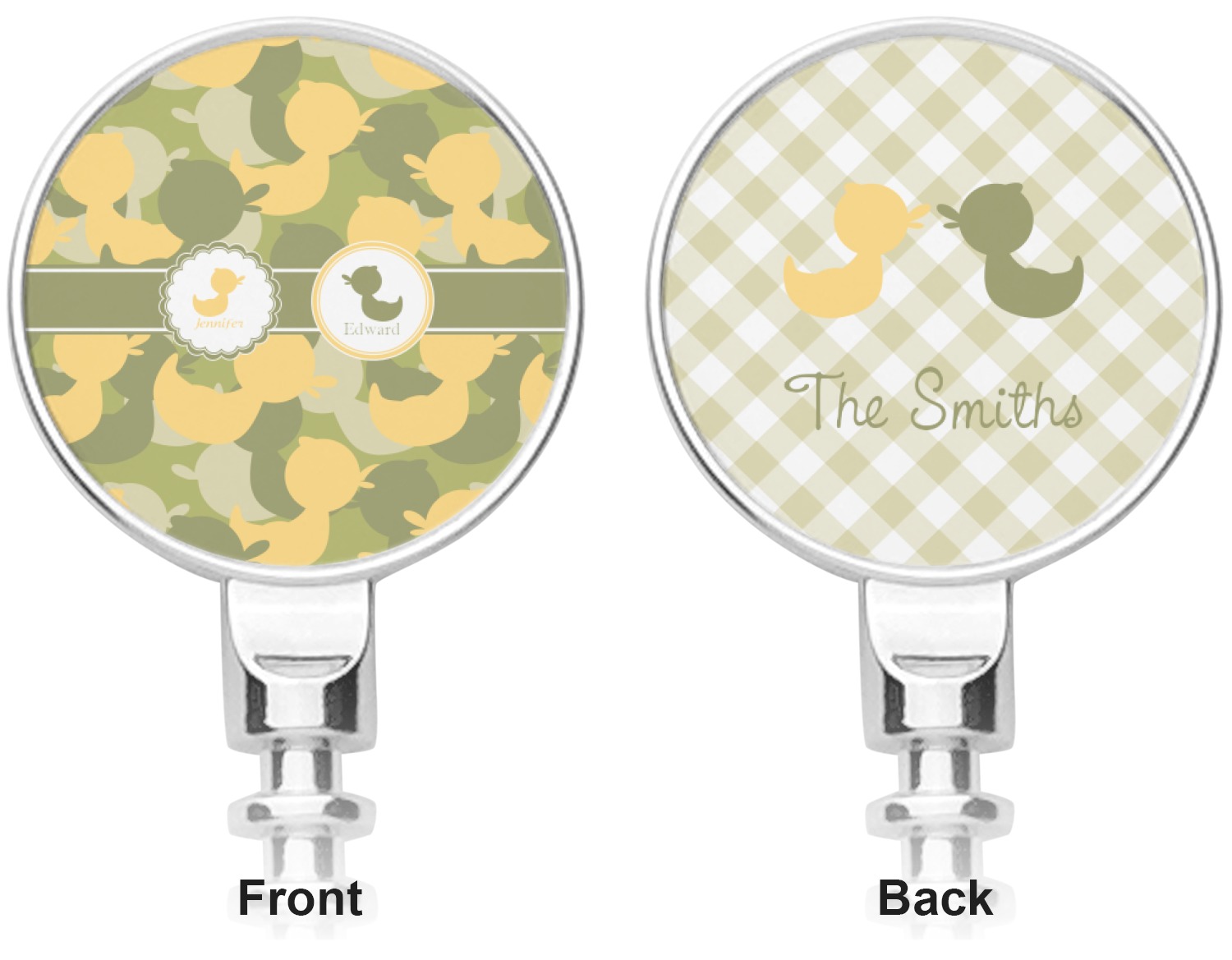 We chose to use a couples / twin personalization on our duck camo design. We used two labels - one is a girl round scalloped, while the second label is a simple round. We used the duck graphics from the camo pattern and used names below the graphics for personalization.
