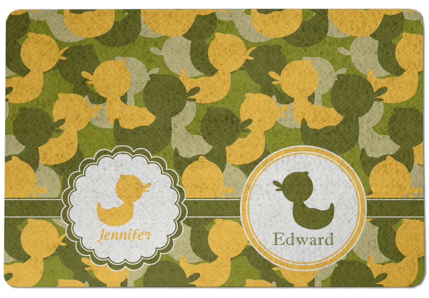 We chose to use a couples / twin personalization on our duck camo design. We used two labels - one is a girl round scalloped, while the second label is a simple round. We used the duck graphics from the camo pattern and used names below the graphics for personalization.