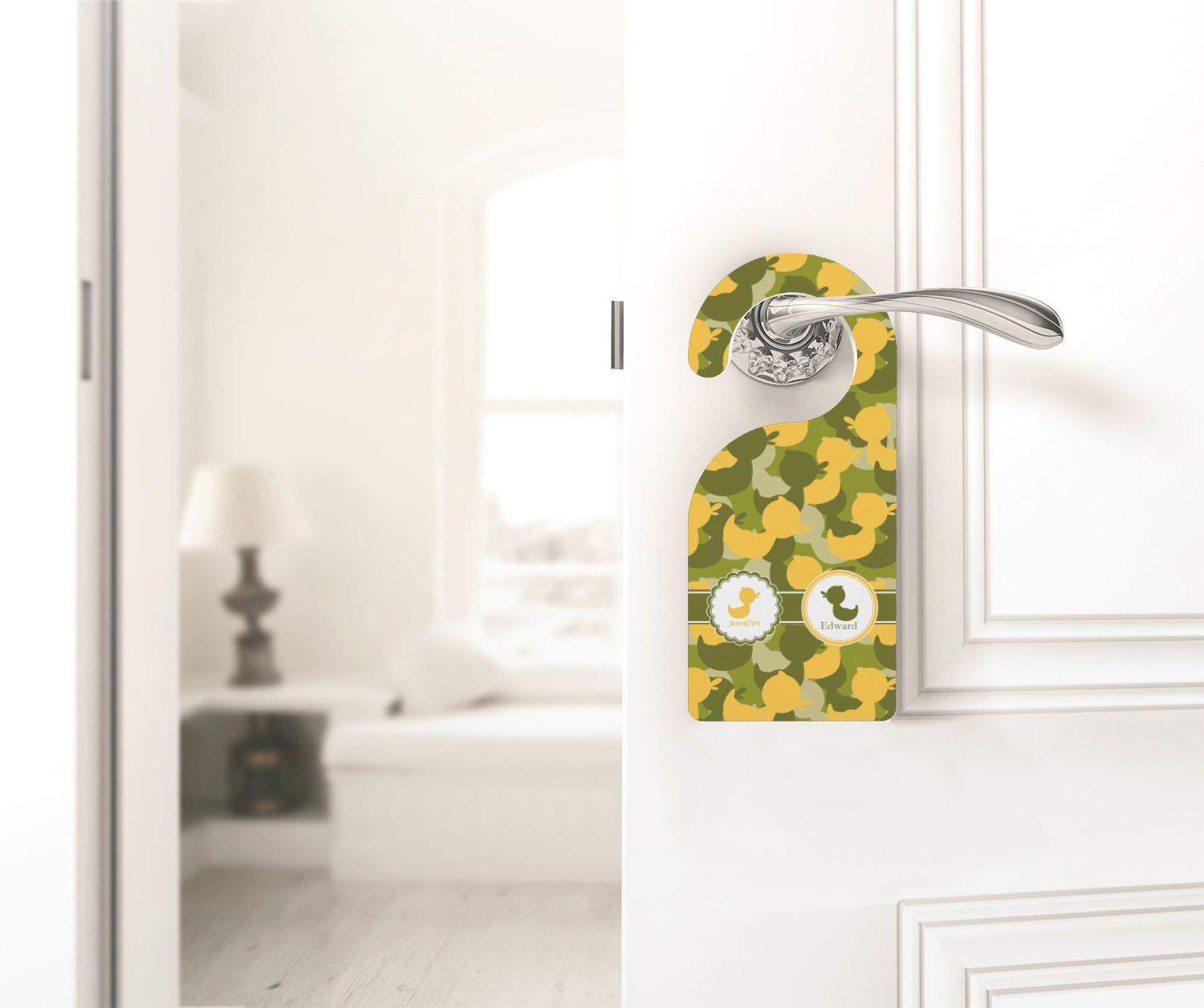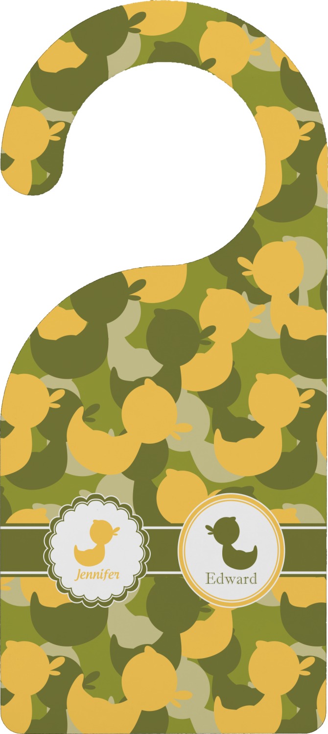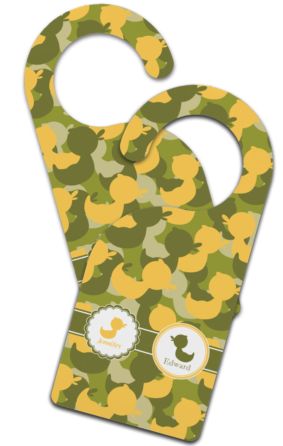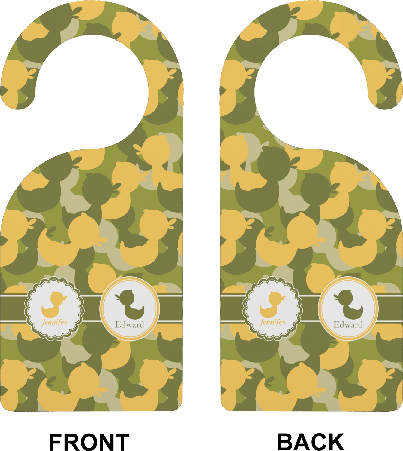 We chose to use a couples / twin personalization on our duck camo design. We used two labels - one is a girl round scalloped, while the second label is a simple round. We used the duck graphics from the camo pattern and used names below the graphics for personalization.