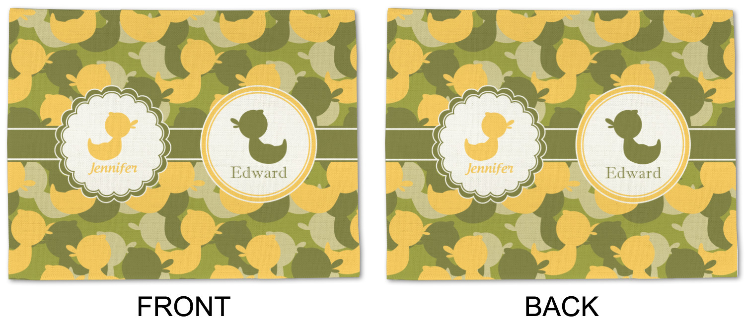 We chose to use a couples / twin personalization on our duck camo design. We used two labels - one is a girl round scalloped, while the second label is a simple round. We used the duck graphics from the camo pattern and used names below the graphics for personalization.
