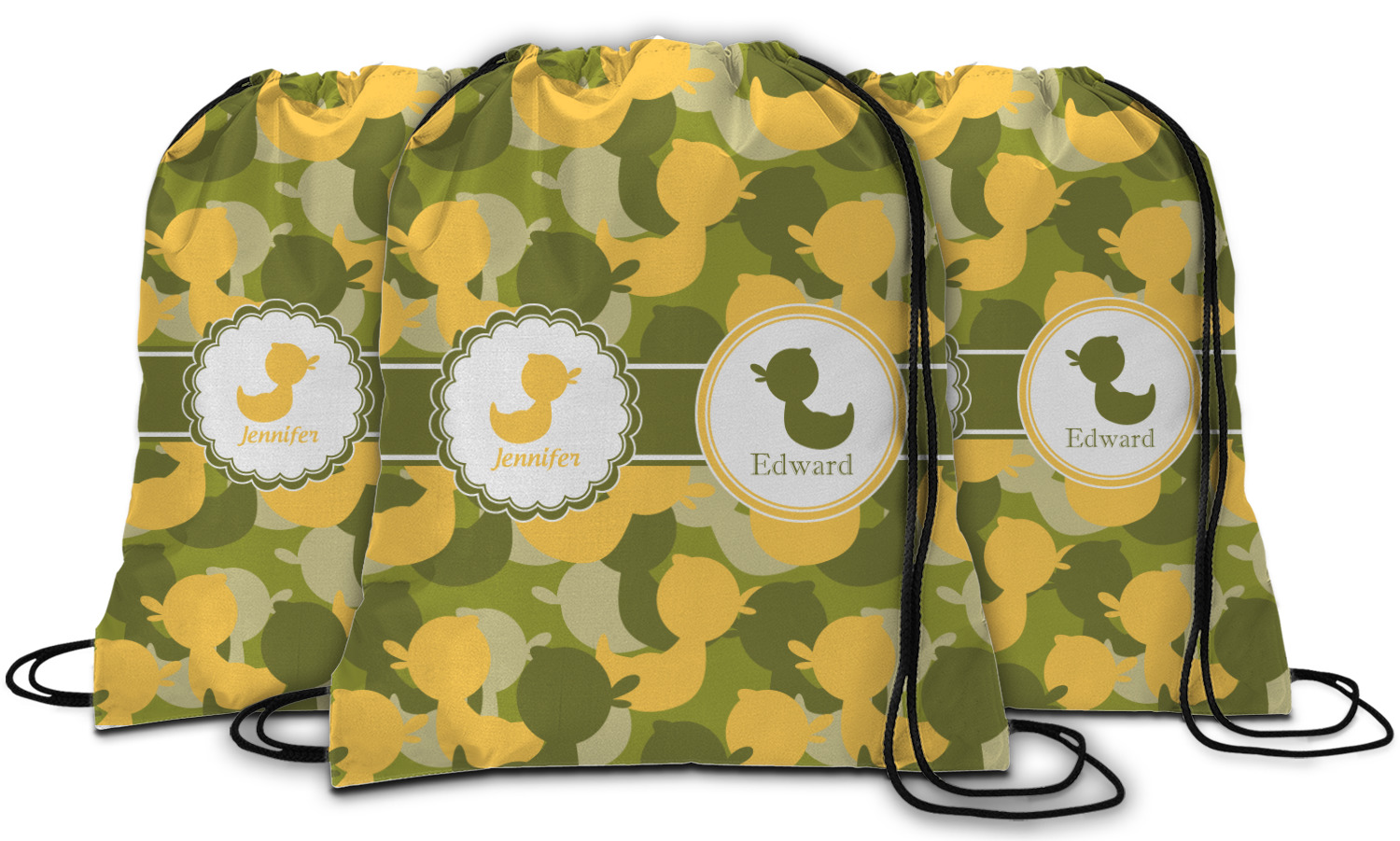 We chose to use a couples / twin personalization on our duck camo design. We used two labels - one is a girl round scalloped, while the second label is a simple round. We used the duck graphics from the camo pattern and used names below the graphics for personalization.