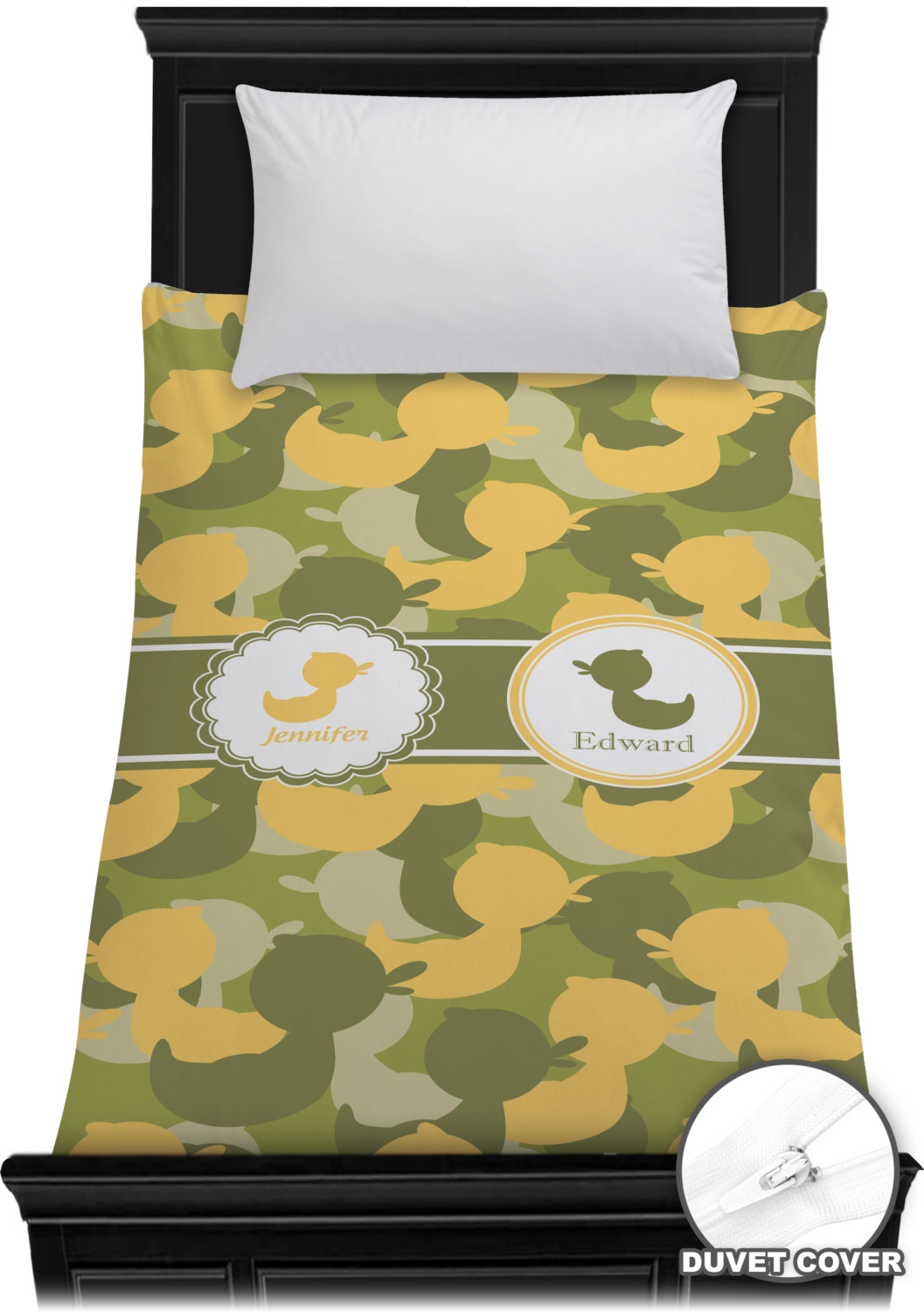 We chose to use a couples / twin personalization on our duck camo design. We used two labels - one is a girl round scalloped, while the second label is a simple round. We used the duck graphics from the camo pattern and used names below the graphics for personalization.