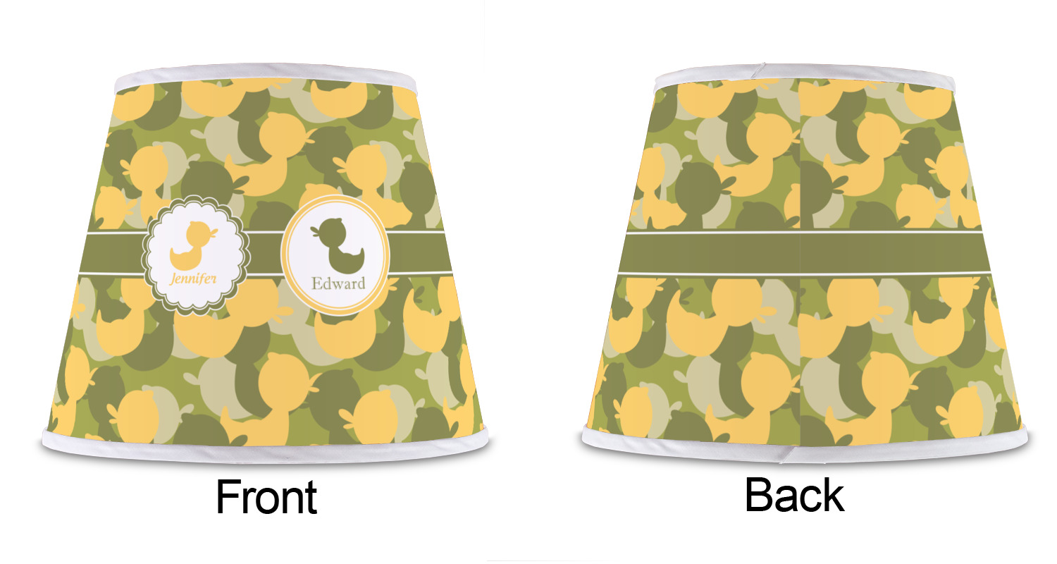 We chose to use a couples / twin personalization on our duck camo design. We used two labels - one is a girl round scalloped, while the second label is a simple round. We used the duck graphics from the camo pattern and used names below the graphics for personalization.