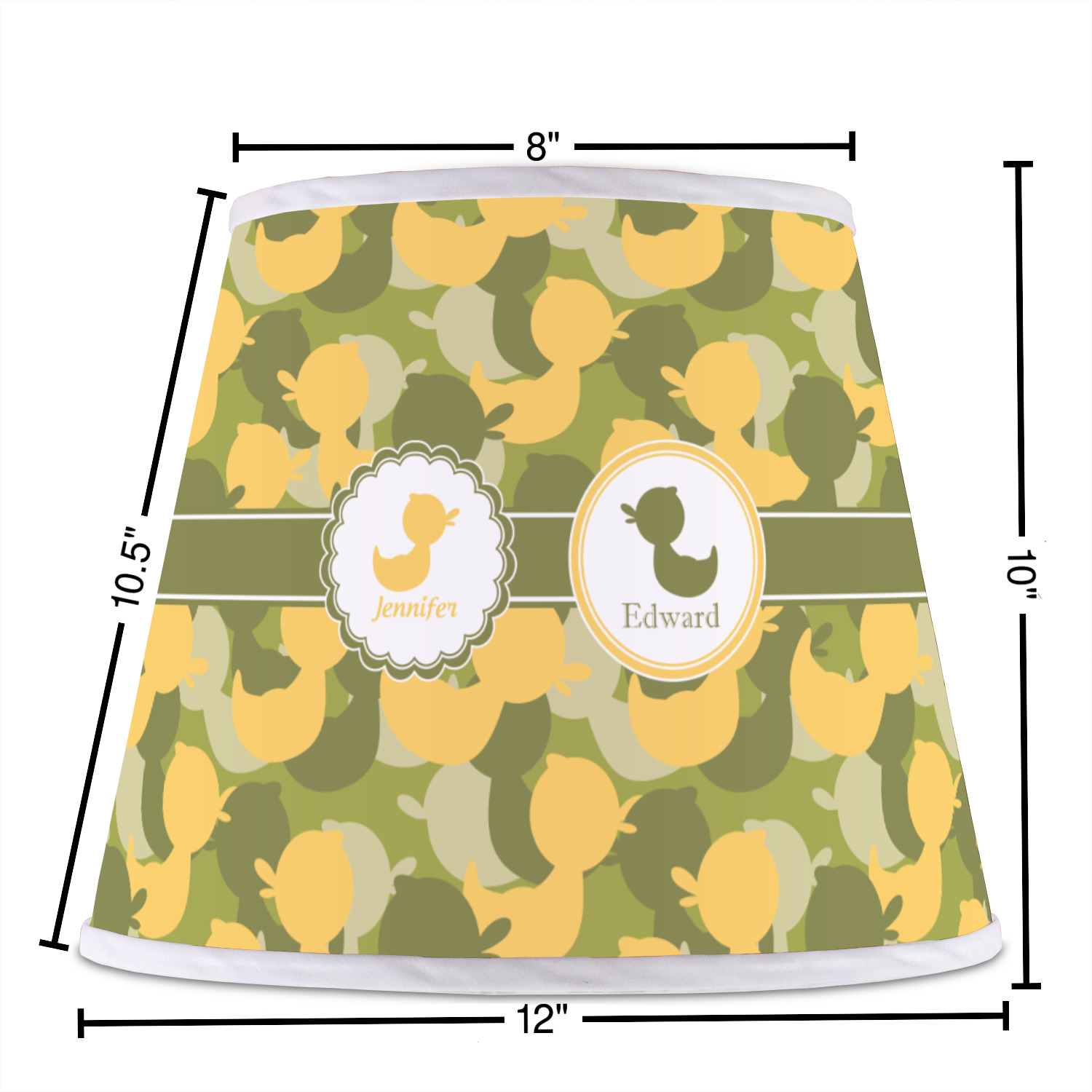 The base of this lampshade is 12 inches in diameter, and the top spans 8 inches in diameter. The total height of the lampshade is 10 inches. The angled nature of this custom lampshade concentrates the light, making it ideal for smaller spaces. This lampshade is made of matte, polyfilm, and displays your customization in its middle. The top and bottom of this colorful lamp shade are lined with a white fabric ribbon (which can be replaced with black inside the design studio) which frames your design and creates a sophisticated finish. As an UNO fitter lampshade, this unique lamp shade will fit a variety of bases.