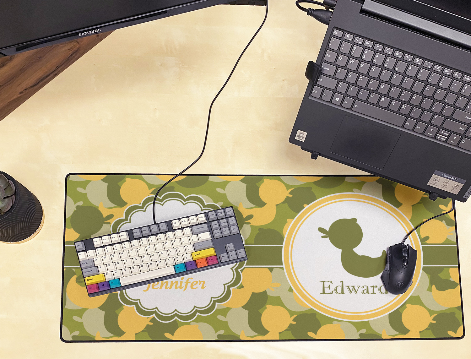 We chose to use a couples / twin personalization on our duck camo design. We used two labels - one is a girl round scalloped, while the second label is a simple round. We used the duck graphics from the camo pattern and used names below the graphics for personalization.