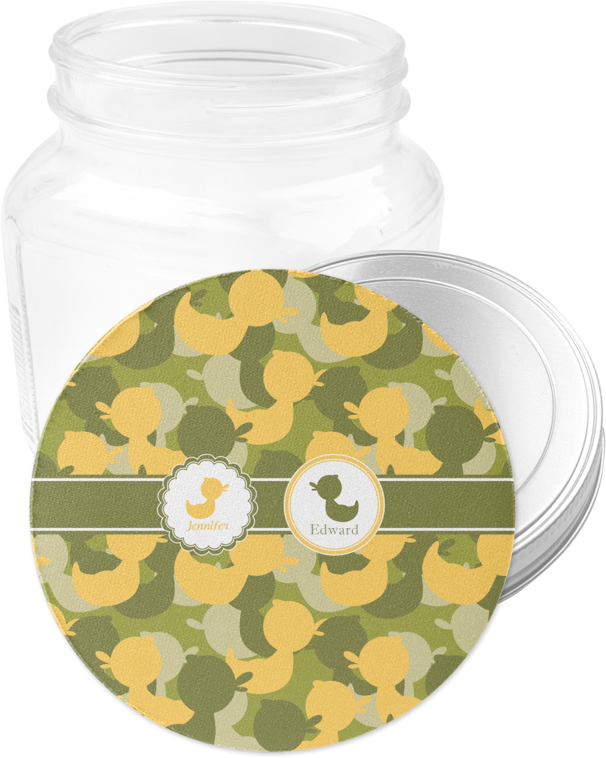 We chose to use a couples / twin personalization on our duck camo design. We used two labels - one is a girl round scalloped, while the second label is a simple round. We used the duck graphics from the camo pattern and used names below the graphics for personalization.
