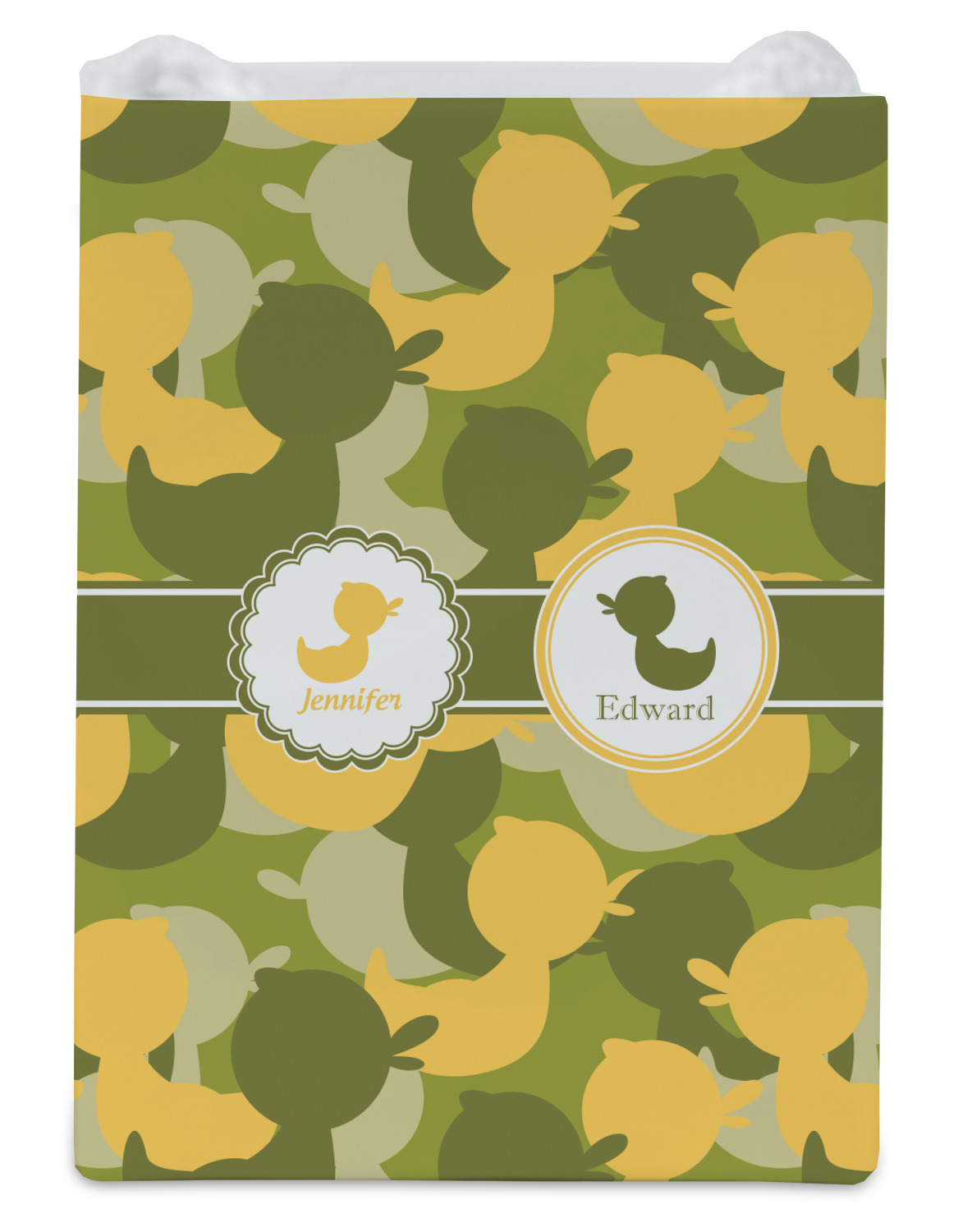 We chose to use a couples / twin personalization on our duck camo design. We used two labels - one is a girl round scalloped, while the second label is a simple round. We used the duck graphics from the camo pattern and used names below the graphics for personalization.