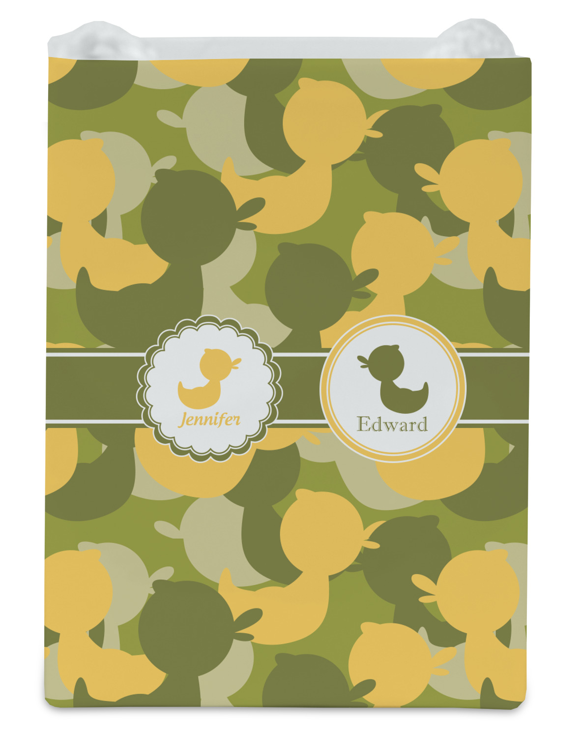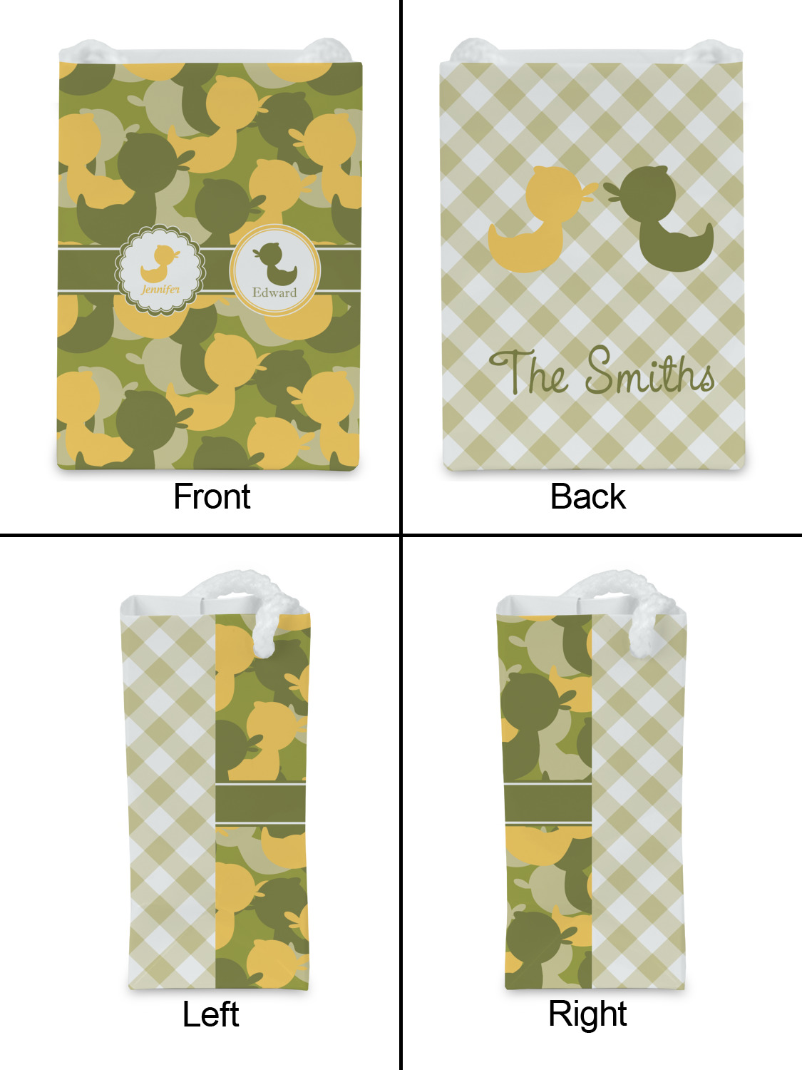 We chose to use a couples / twin personalization on our duck camo design. We used two labels - one is a girl round scalloped, while the second label is a simple round. We used the duck graphics from the camo pattern and used names below the graphics for personalization.