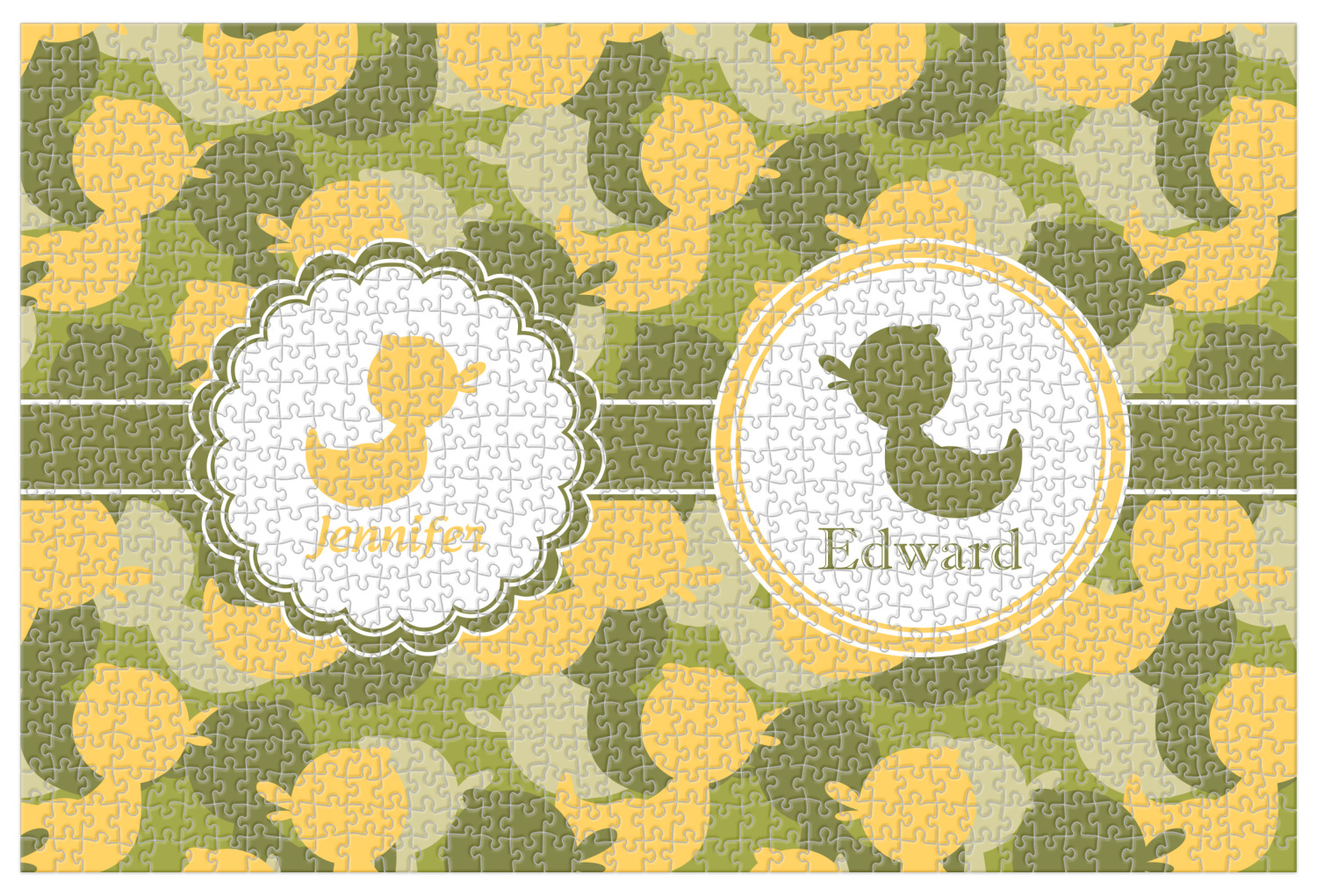 We chose to use a couples / twin personalization on our duck camo design. We used two labels - one is a girl round scalloped, while the second label is a simple round. We used the duck graphics from the camo pattern and used names below the graphics for personalization.