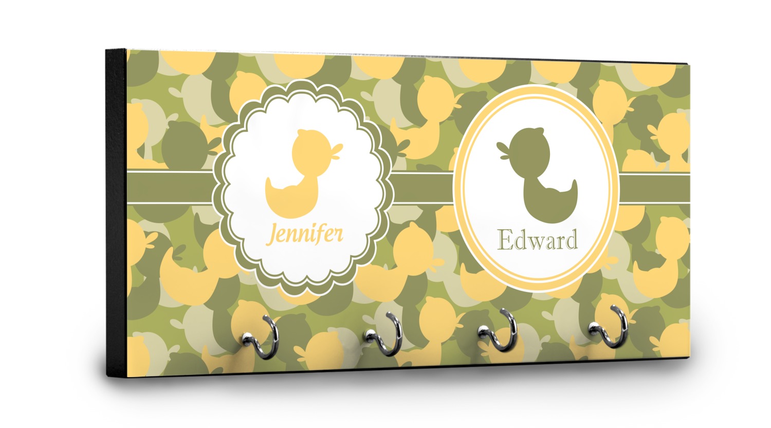 We chose to use a couples / twin personalization on our duck camo design. We used two labels - one is a girl round scalloped, while the second label is a simple round. We used the duck graphics from the camo pattern and used names below the graphics for personalization.