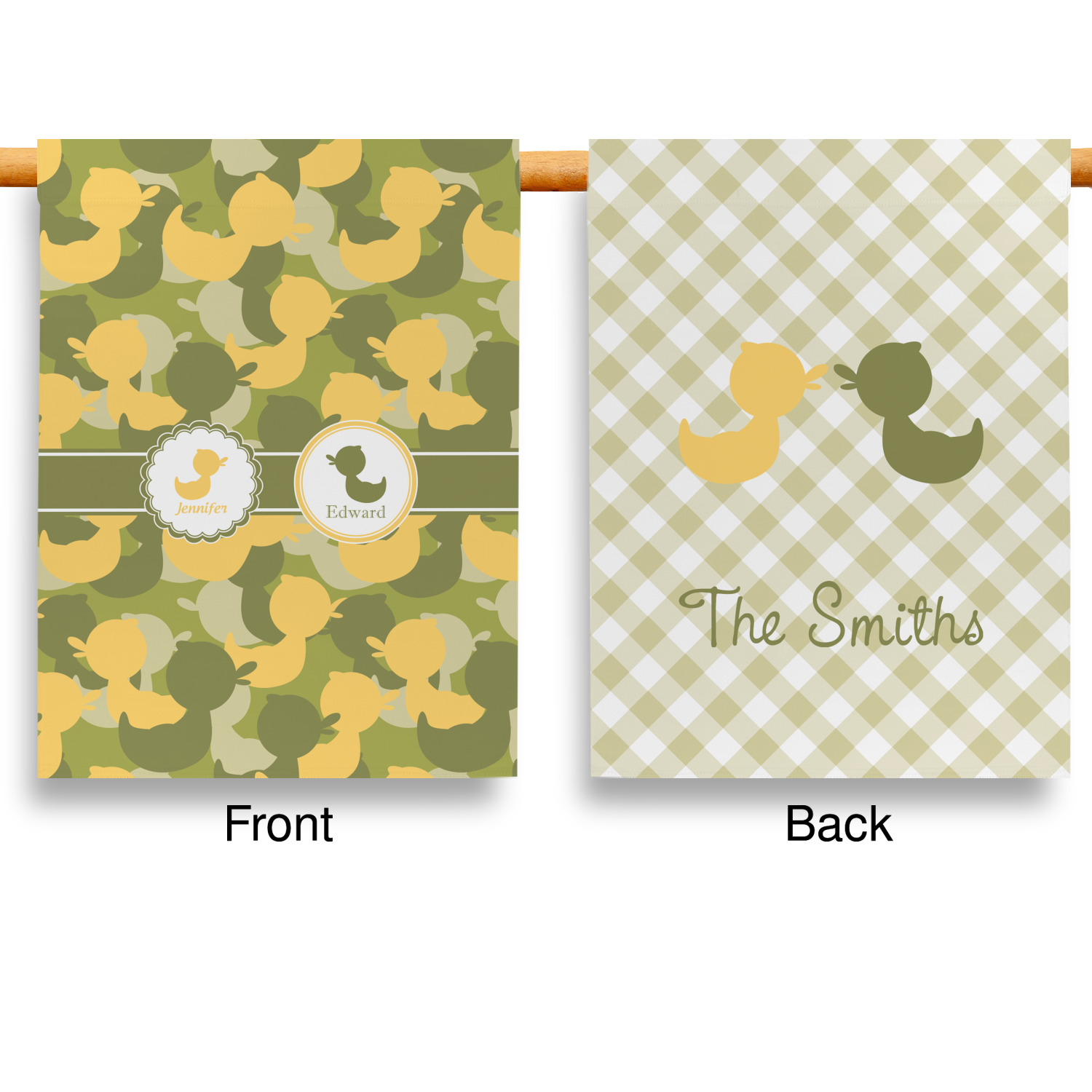 These custom garden flags are made of a durable, double-ply, polyester weave, allowing them to withstand the elements year round. The small flags measure at approximately 12 by 18 inches. The large flags measure out to 28 by 37 inches. You can order these decorative flags with your customization printed on the front only, or the front and back.