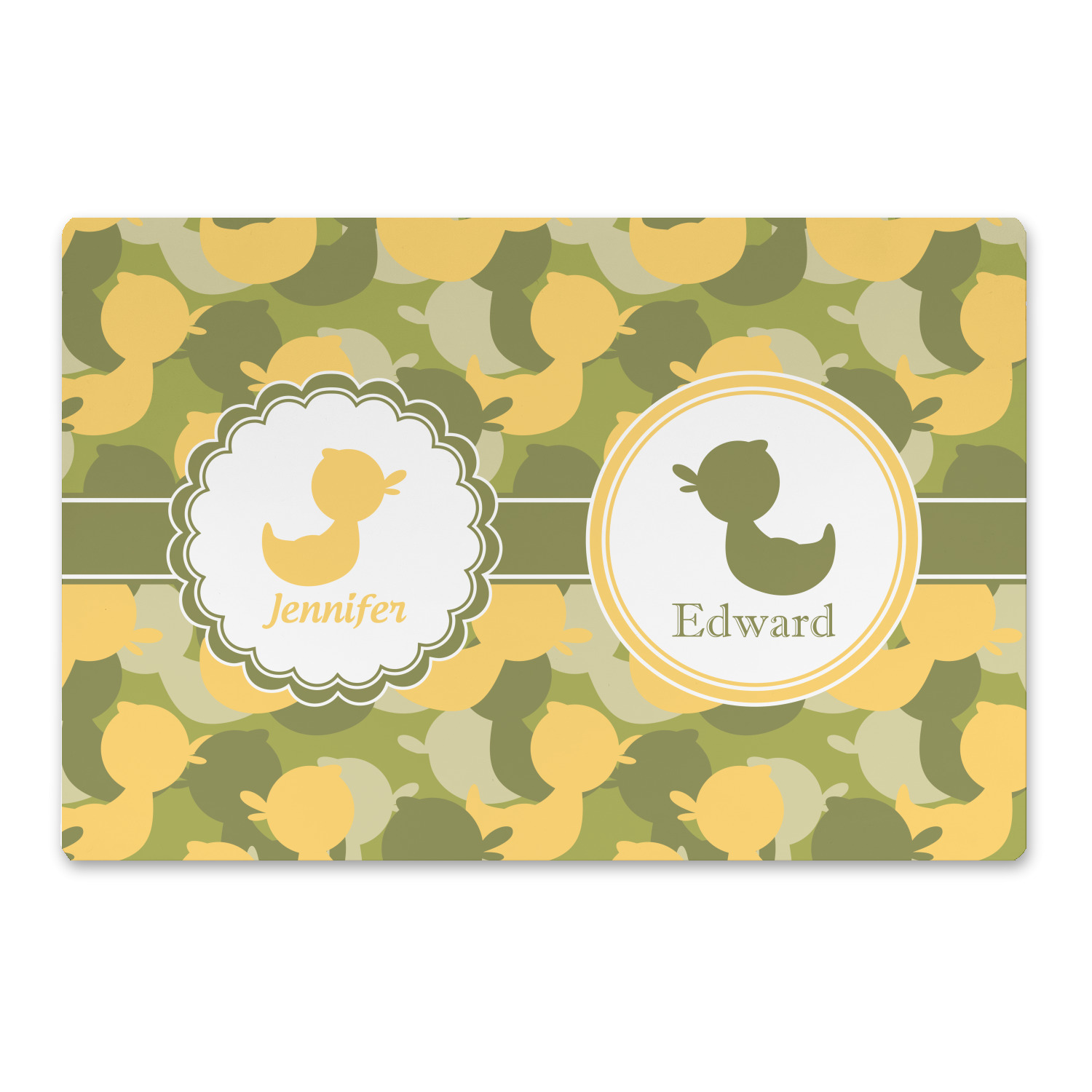 We chose to use a couples / twin personalization on our duck camo design. We used two labels - one is a girl round scalloped, while the second label is a simple round. We used the duck graphics from the camo pattern and used names below the graphics for personalization.