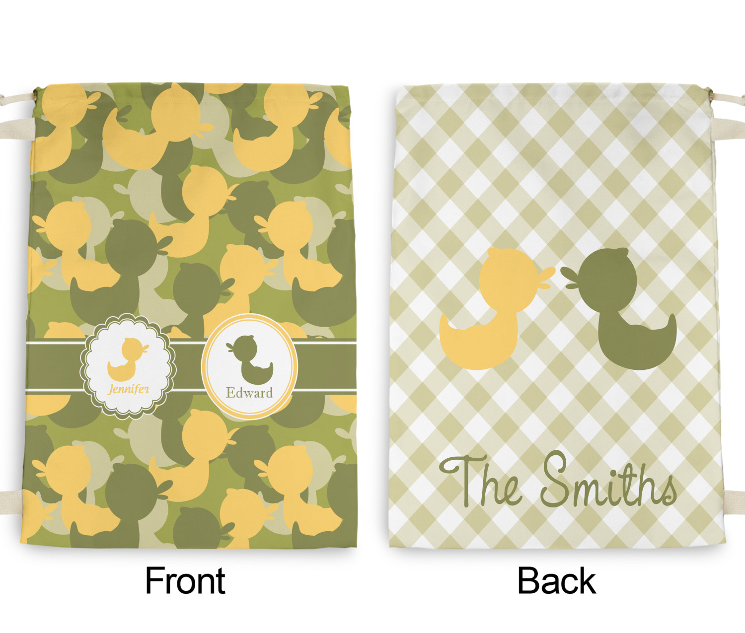 We chose to use a couples / twin personalization on our duck camo design. We used two labels - one is a girl round scalloped, while the second label is a simple round. We used the duck graphics from the camo pattern and used names below the graphics for personalization.