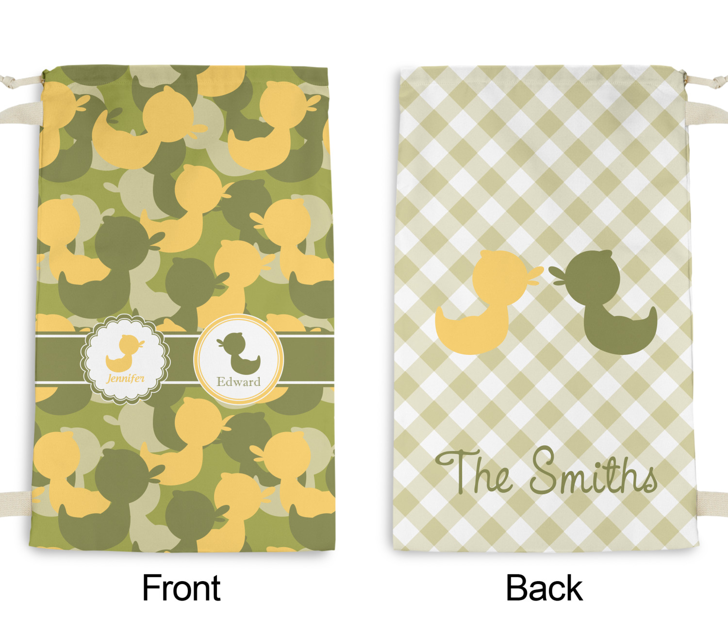 We chose to use a couples / twin personalization on our duck camo design. We used two labels - one is a girl round scalloped, while the second label is a simple round. We used the duck graphics from the camo pattern and used names below the graphics for personalization.