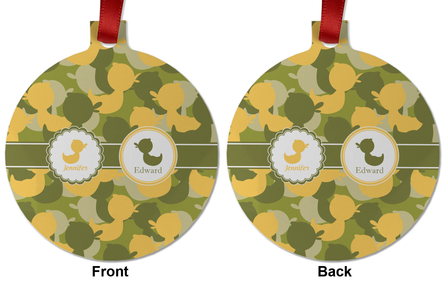 We chose to use a couples / twin personalization on our duck camo design. We used two labels - one is a girl round scalloped, while the second label is a simple round. We used the duck graphics from the camo pattern and used names below the graphics for personalization.