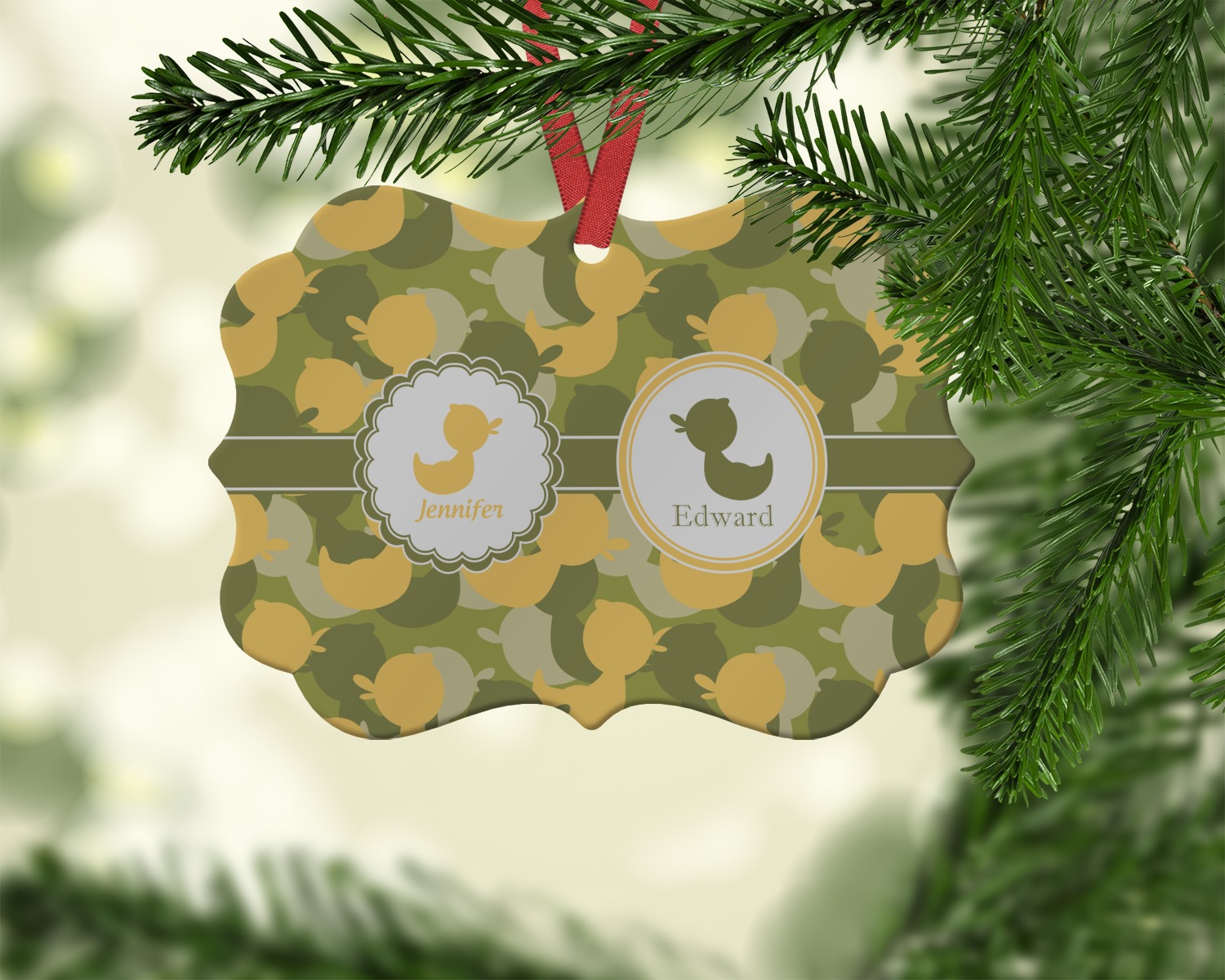 We chose to use a couples / twin personalization on our duck camo design. We used two labels - one is a girl round scalloped, while the second label is a simple round. We used the duck graphics from the camo pattern and used names below the graphics for personalization.