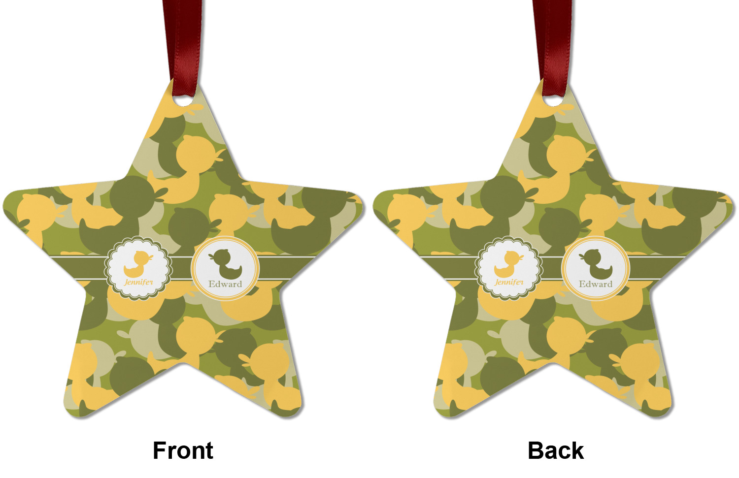 We chose to use a couples / twin personalization on our duck camo design. We used two labels - one is a girl round scalloped, while the second label is a simple round. We used the duck graphics from the camo pattern and used names below the graphics for personalization.