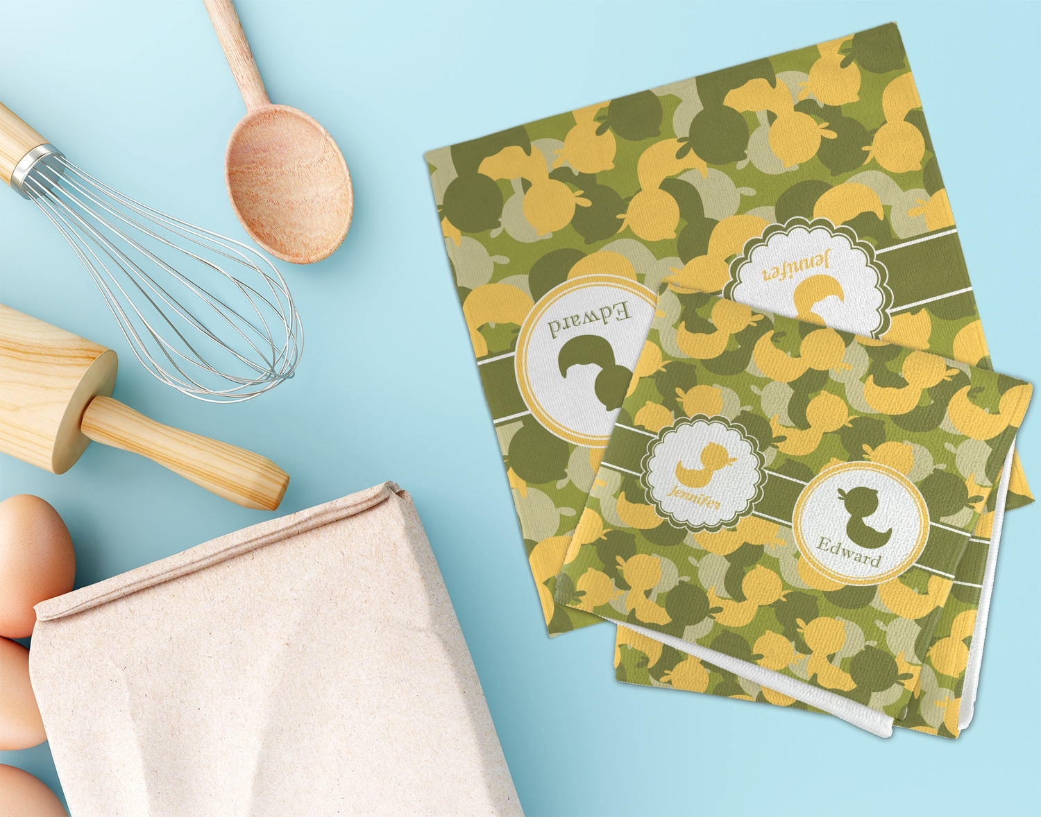 We chose to use a couples / twin personalization on our duck camo design. We used two labels - one is a girl round scalloped, while the second label is a simple round. We used the duck graphics from the camo pattern and used names below the graphics for personalization.