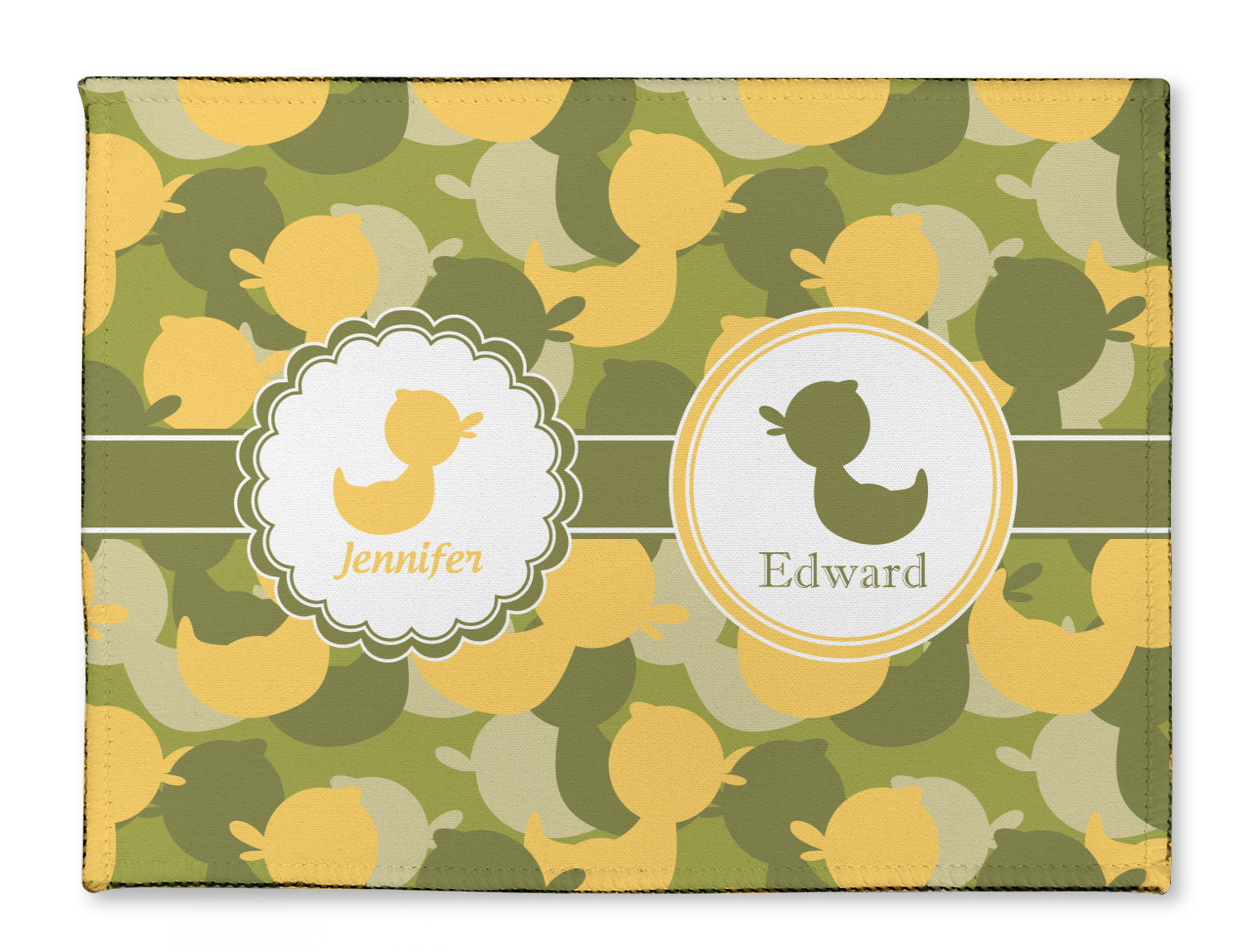 We chose to use a couples / twin personalization on our duck camo design. We used two labels - one is a girl round scalloped, while the second label is a simple round. We used the duck graphics from the camo pattern and used names below the graphics for personalization.