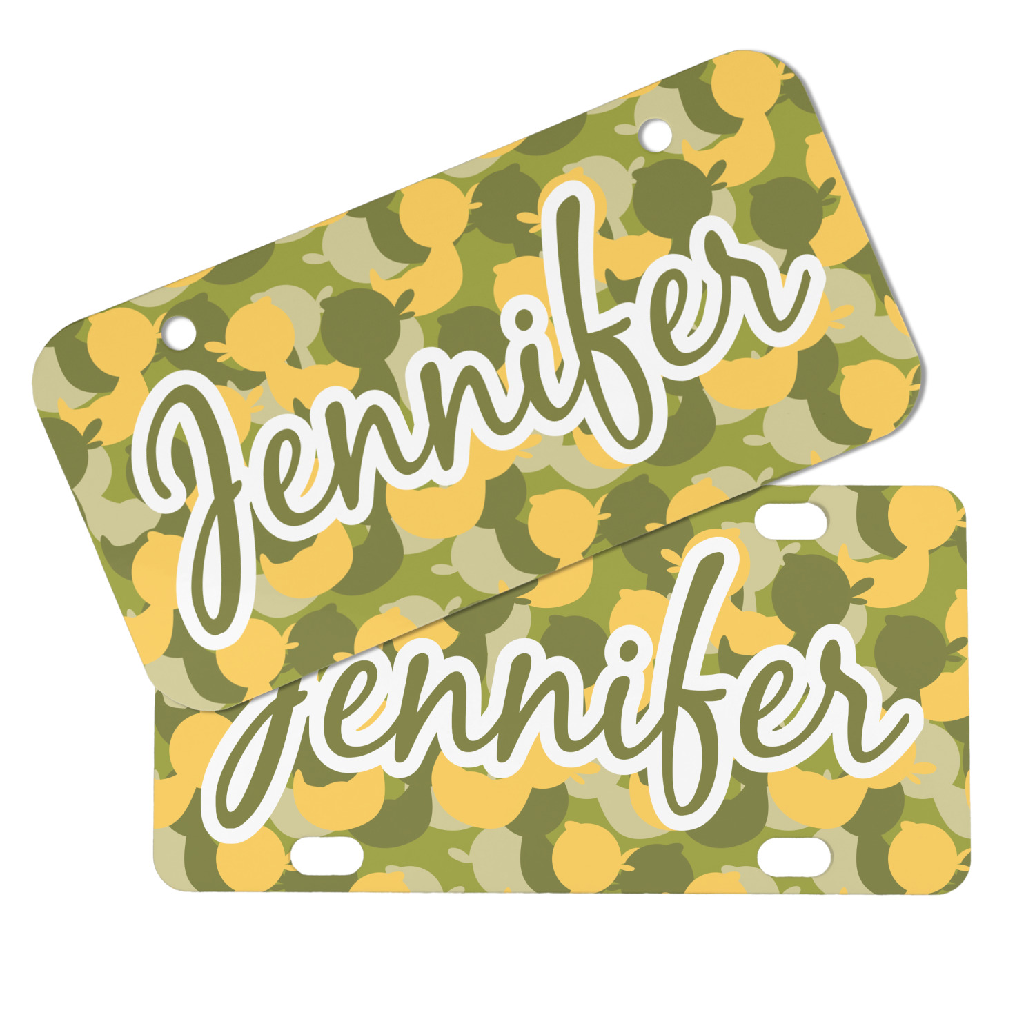 We chose to use a couples / twin personalization on our duck camo design. We used two labels - one is a girl round scalloped, while the second label is a simple round. We used the duck graphics from the camo pattern and used names below the graphics for personalization.