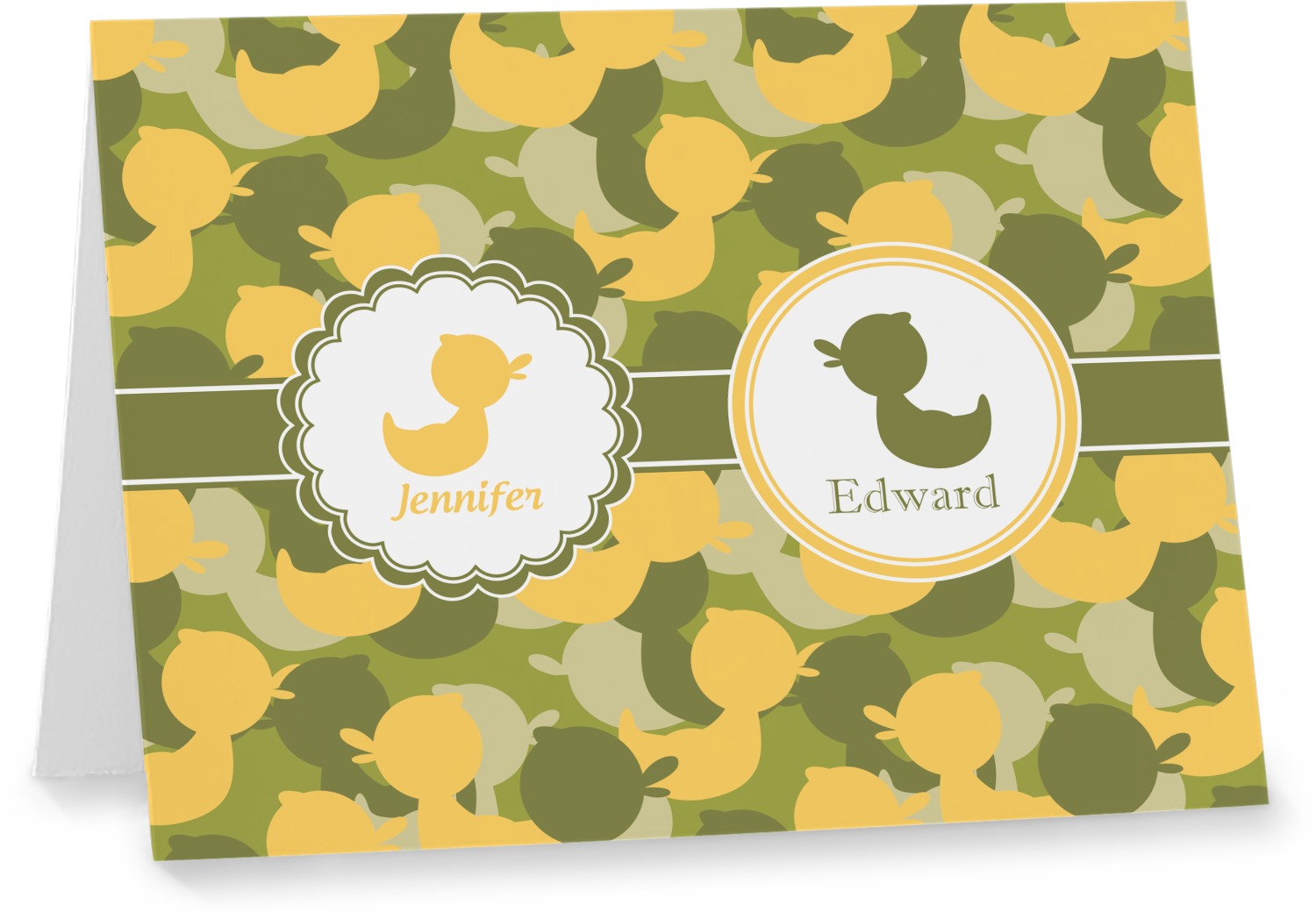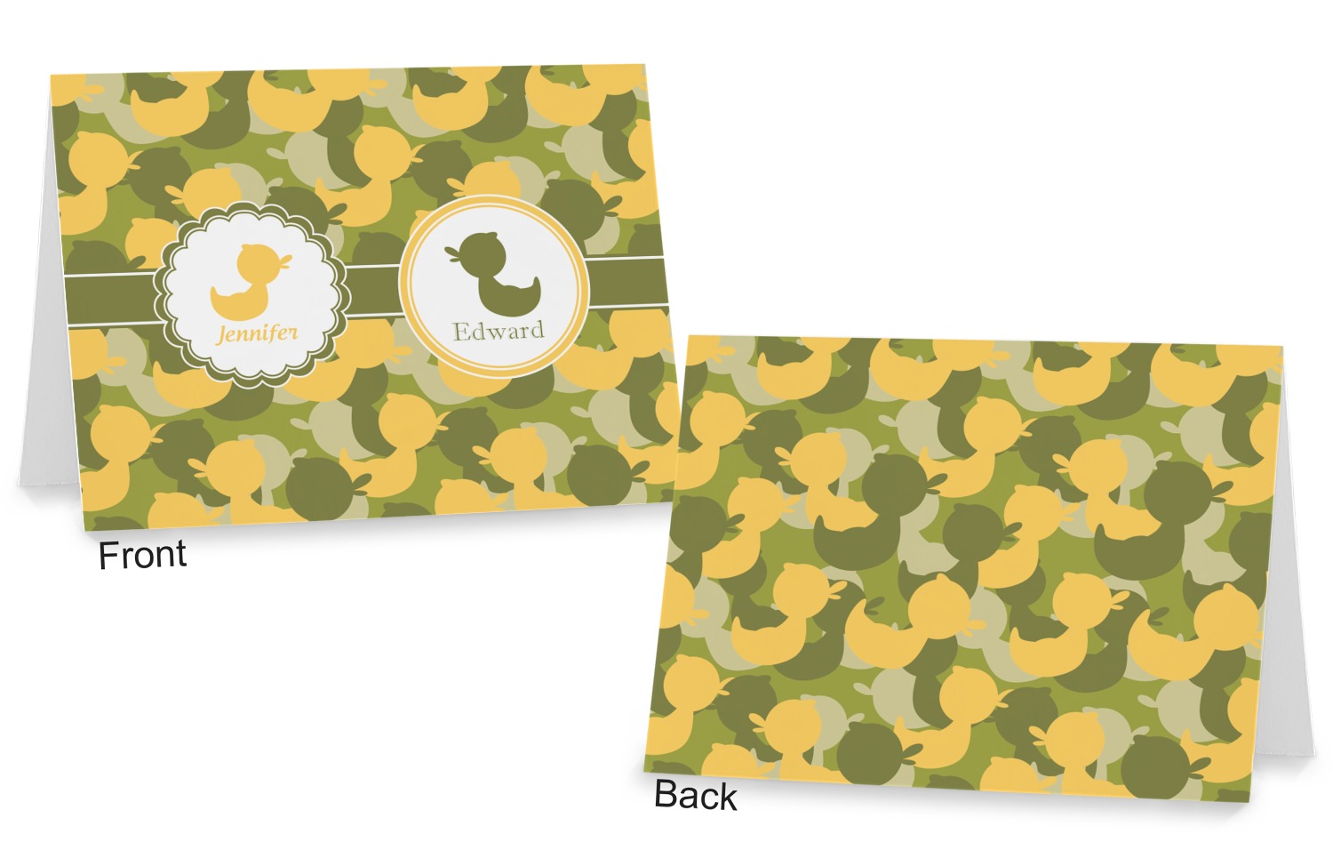 We chose to use a couples / twin personalization on our duck camo design. We used two labels - one is a girl round scalloped, while the second label is a simple round. We used the duck graphics from the camo pattern and used names below the graphics for personalization.