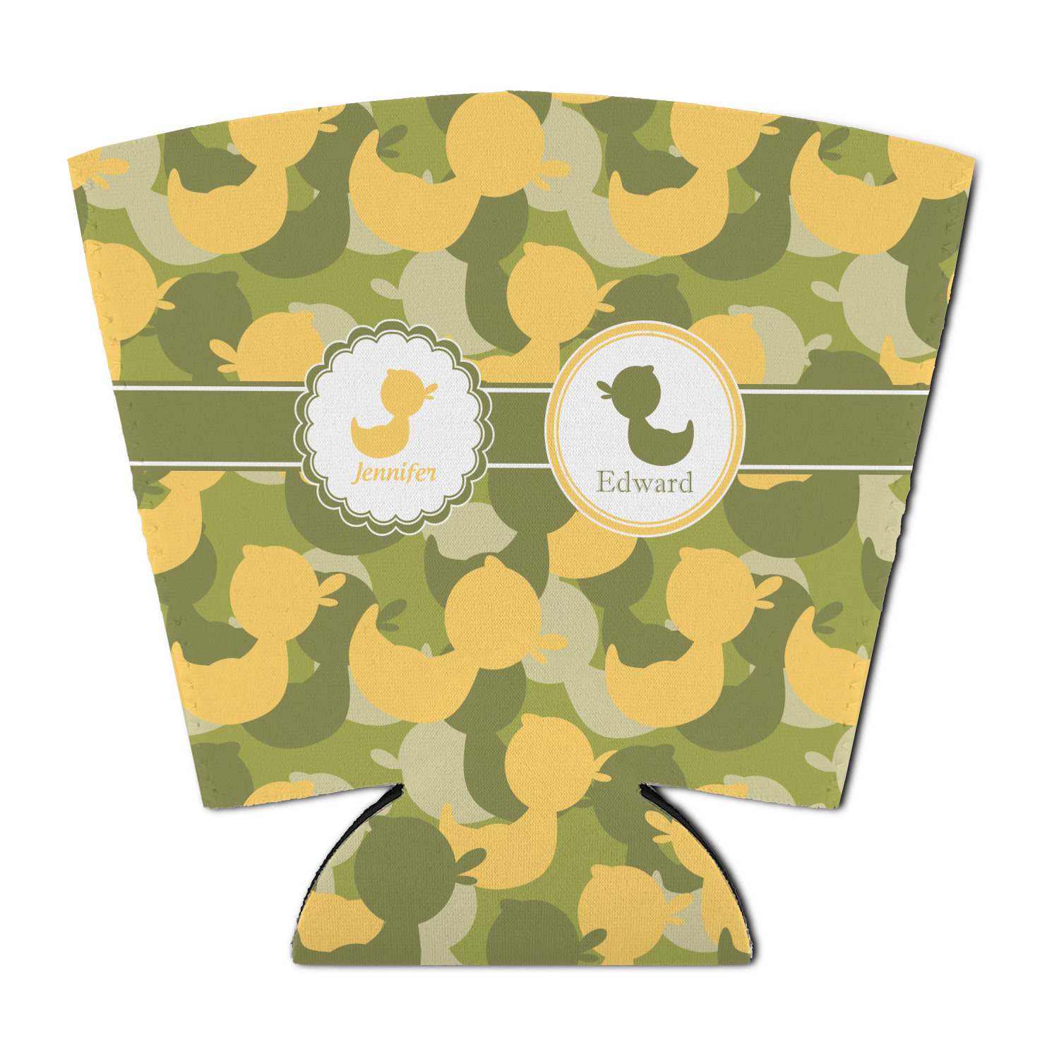 We chose to use a couples / twin personalization on our duck camo design. We used two labels - one is a girl round scalloped, while the second label is a simple round. We used the duck graphics from the camo pattern and used names below the graphics for personalization.