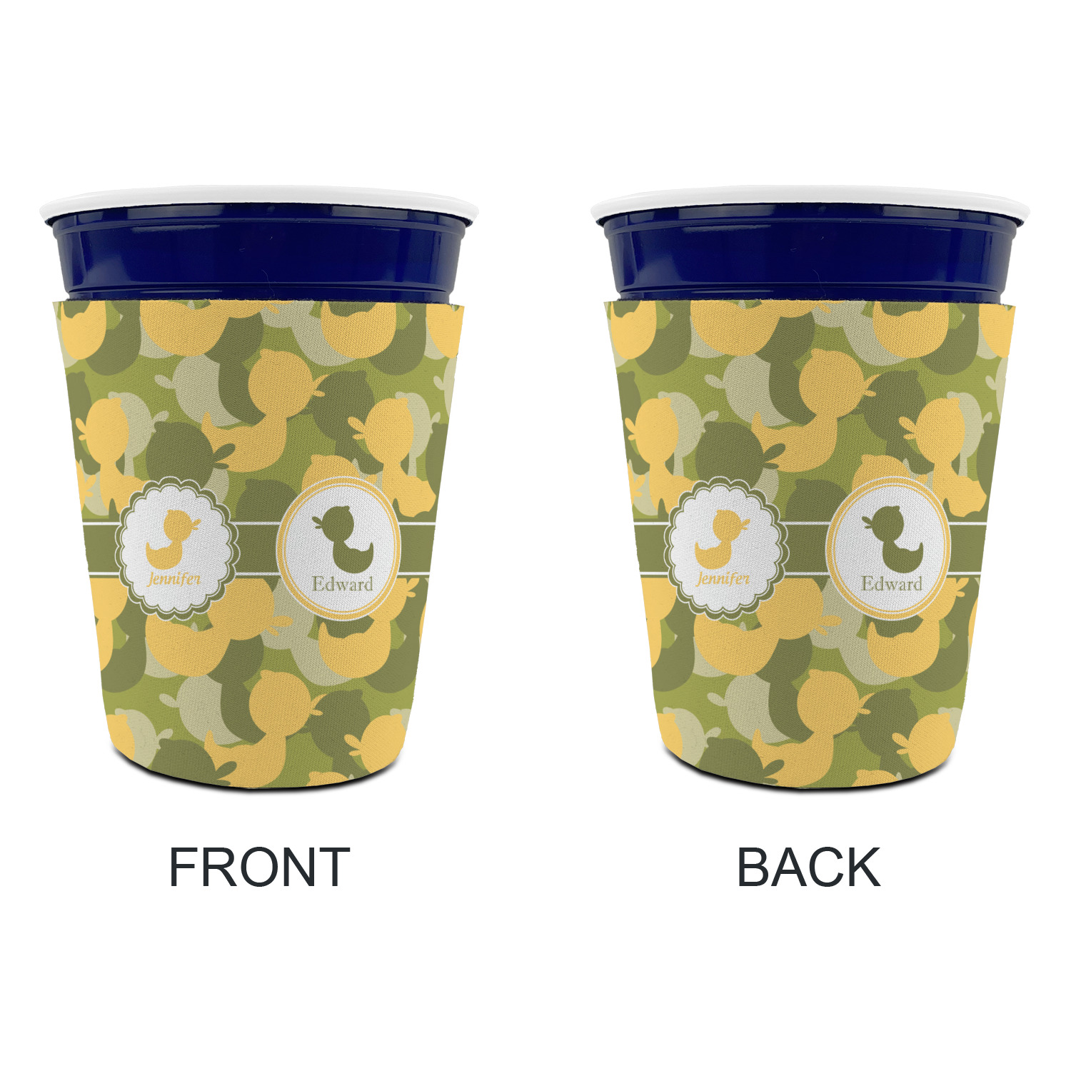 Made from neoprene with a polyester outer fabric and sewn seams, these premium quality party cup sleeves are very durable and will hold up to heavy use. They are available in 2 styles - with a bottom or just a sleeve to go around the outside of the tapered cup. The sleeve covers are about 4" tall and cover about 90% of the classic 16 oz. Solo cup.