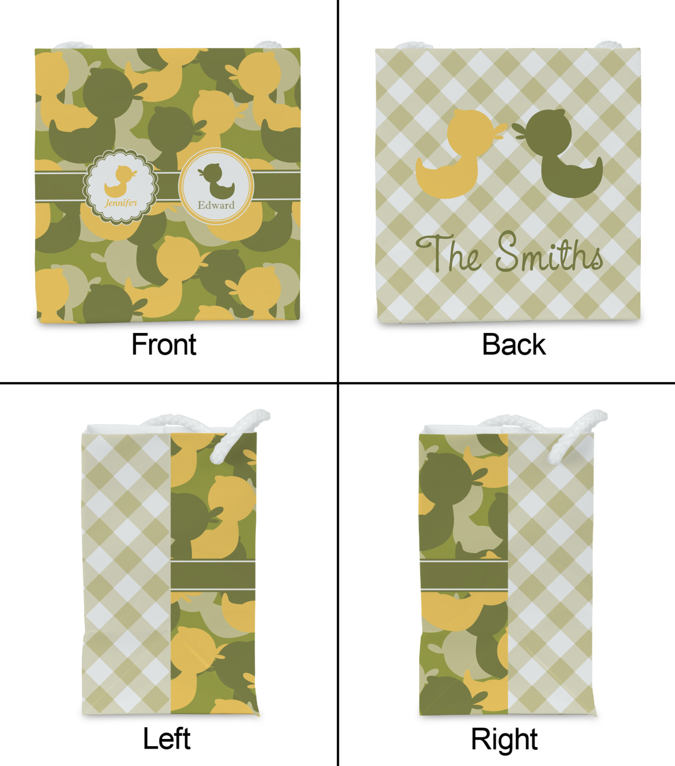 We chose to use a couples / twin personalization on our duck camo design. We used two labels - one is a girl round scalloped, while the second label is a simple round. We used the duck graphics from the camo pattern and used names below the graphics for personalization.