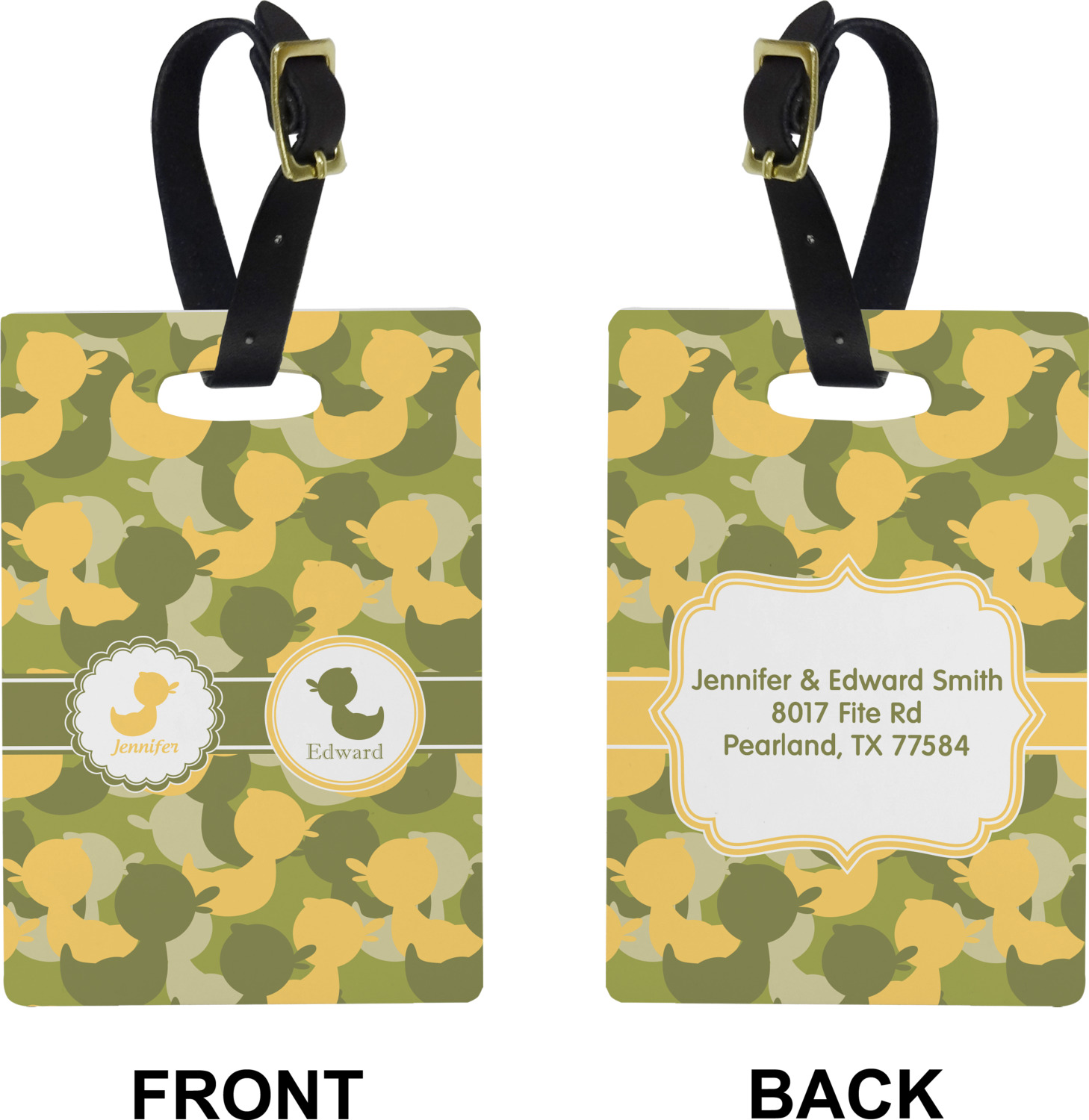 We chose to use a couples / twin personalization on our duck camo design. We used two labels - one is a girl round scalloped, while the second label is a simple round. We used the duck graphics from the camo pattern and used names below the graphics for personalization.
