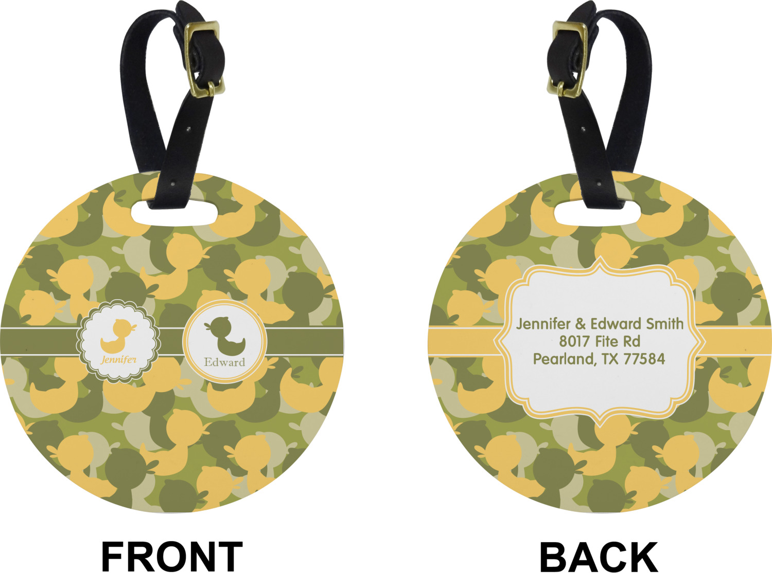 These personalized bag tags are sold in a variety of shapes, so that you may find the product that meets your vision exactly. We sell a round luggage tag, which measures at approximately 4" x 4". Our square luggage tag is about 3.5" x 3.5", while our rectangular version is 2.75" x 4 ".