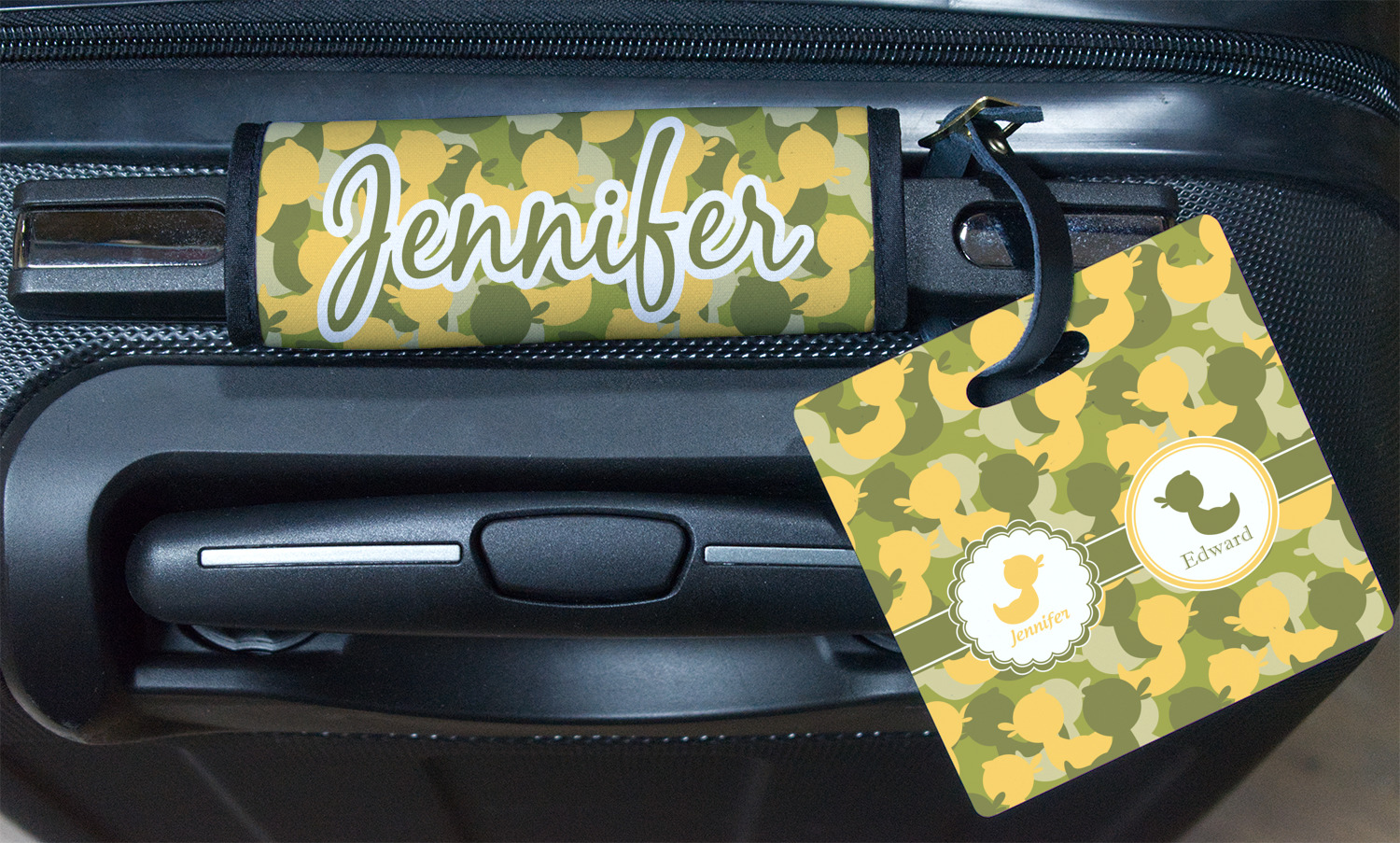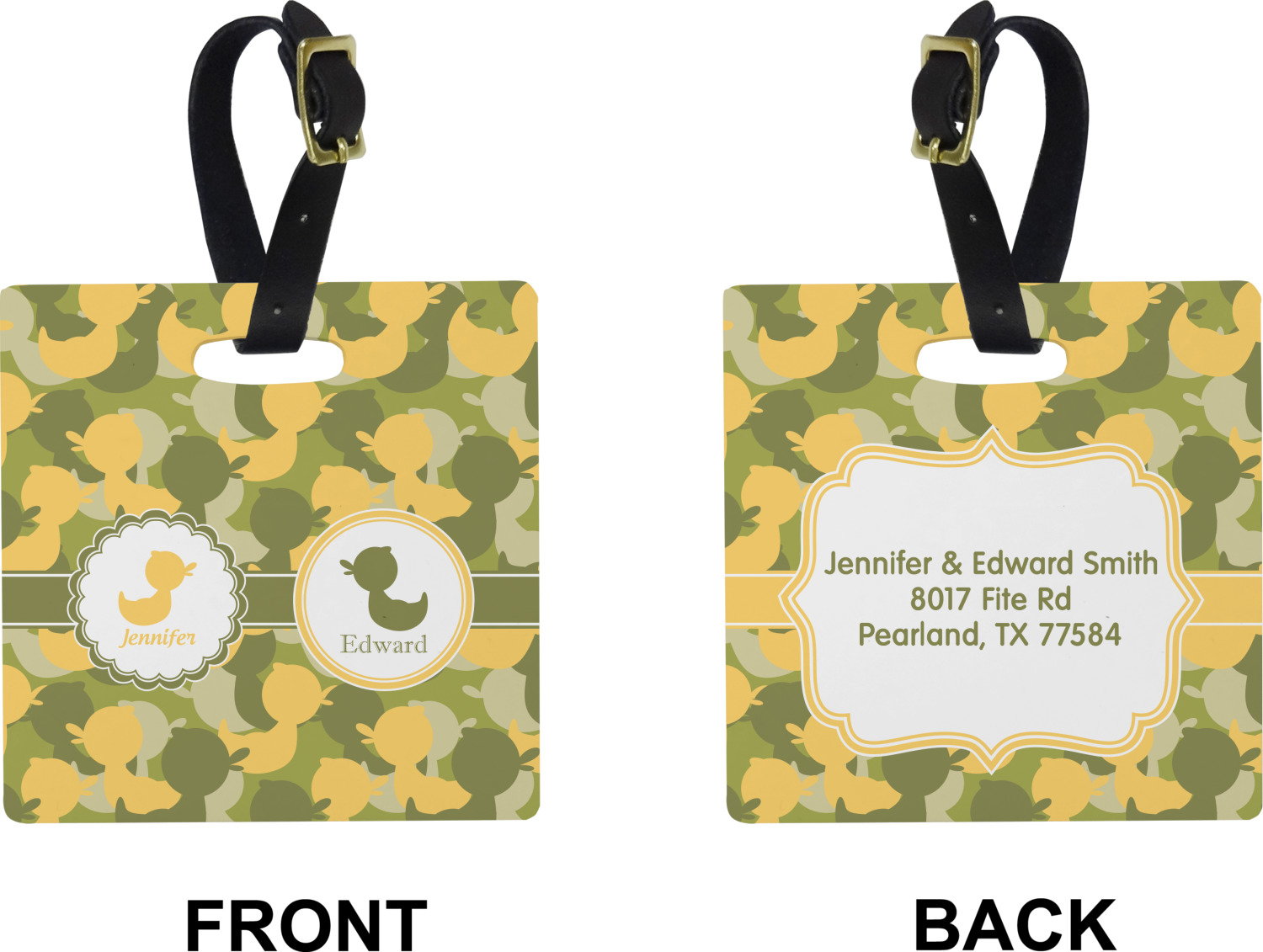 We chose to use a couples / twin personalization on our duck camo design. We used two labels - one is a girl round scalloped, while the second label is a simple round. We used the duck graphics from the camo pattern and used names below the graphics for personalization.