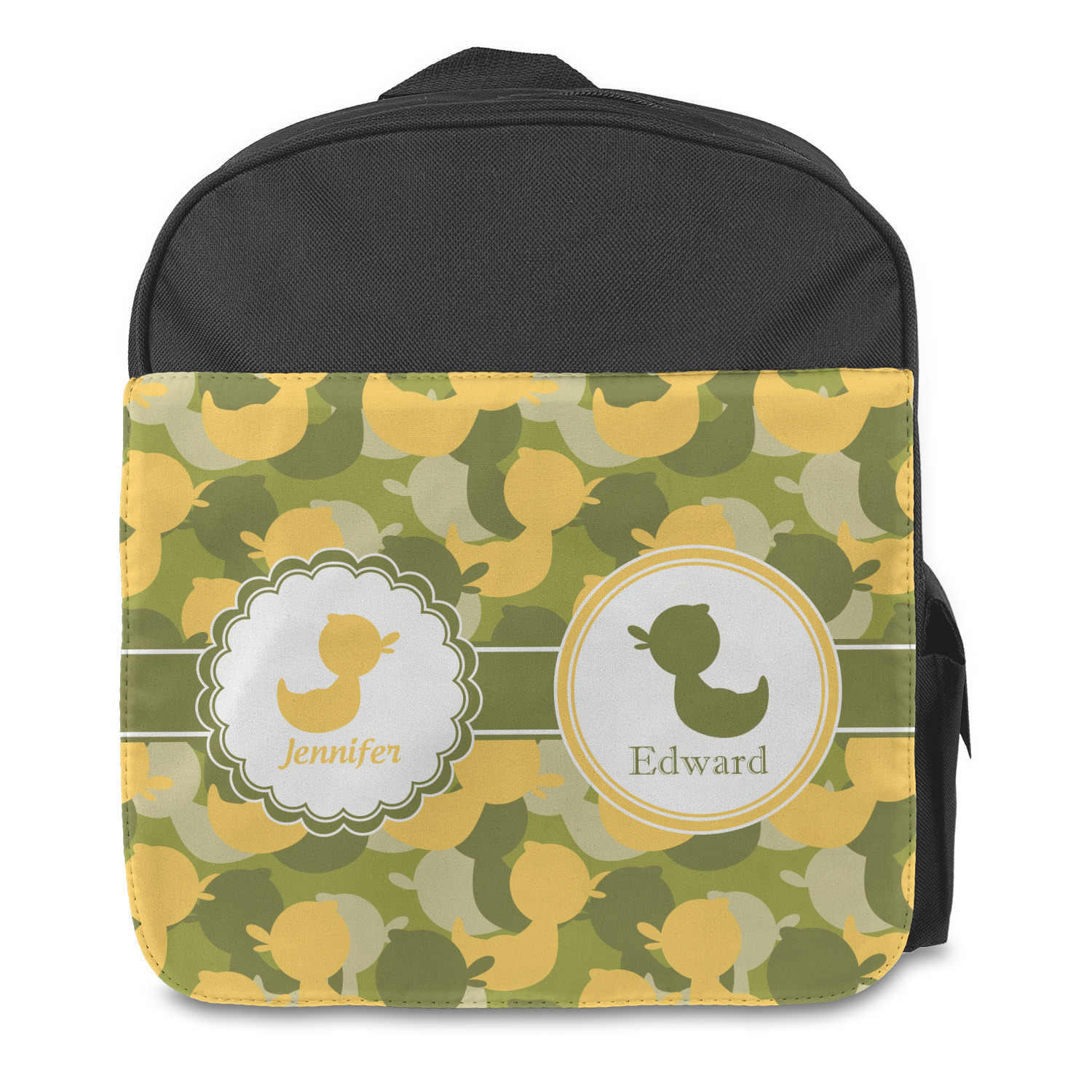 We chose to use a couples / twin personalization on our duck camo design. We used two labels - one is a girl round scalloped, while the second label is a simple round. We used the duck graphics from the camo pattern and used names below the graphics for personalization.