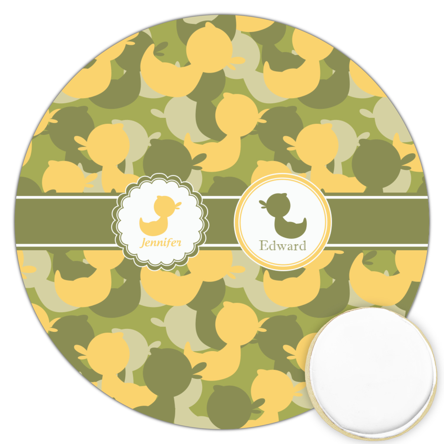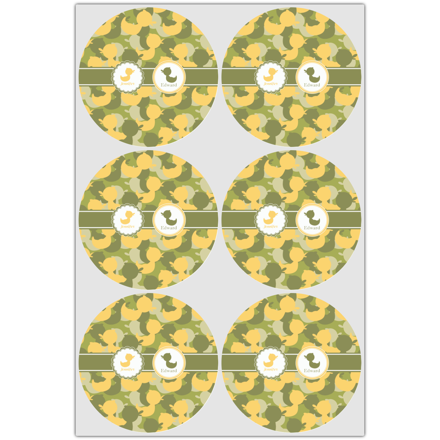 We chose to use a couples / twin personalization on our duck camo design. We used two labels - one is a girl round scalloped, while the second label is a simple round. We used the duck graphics from the camo pattern and used names below the graphics for personalization.