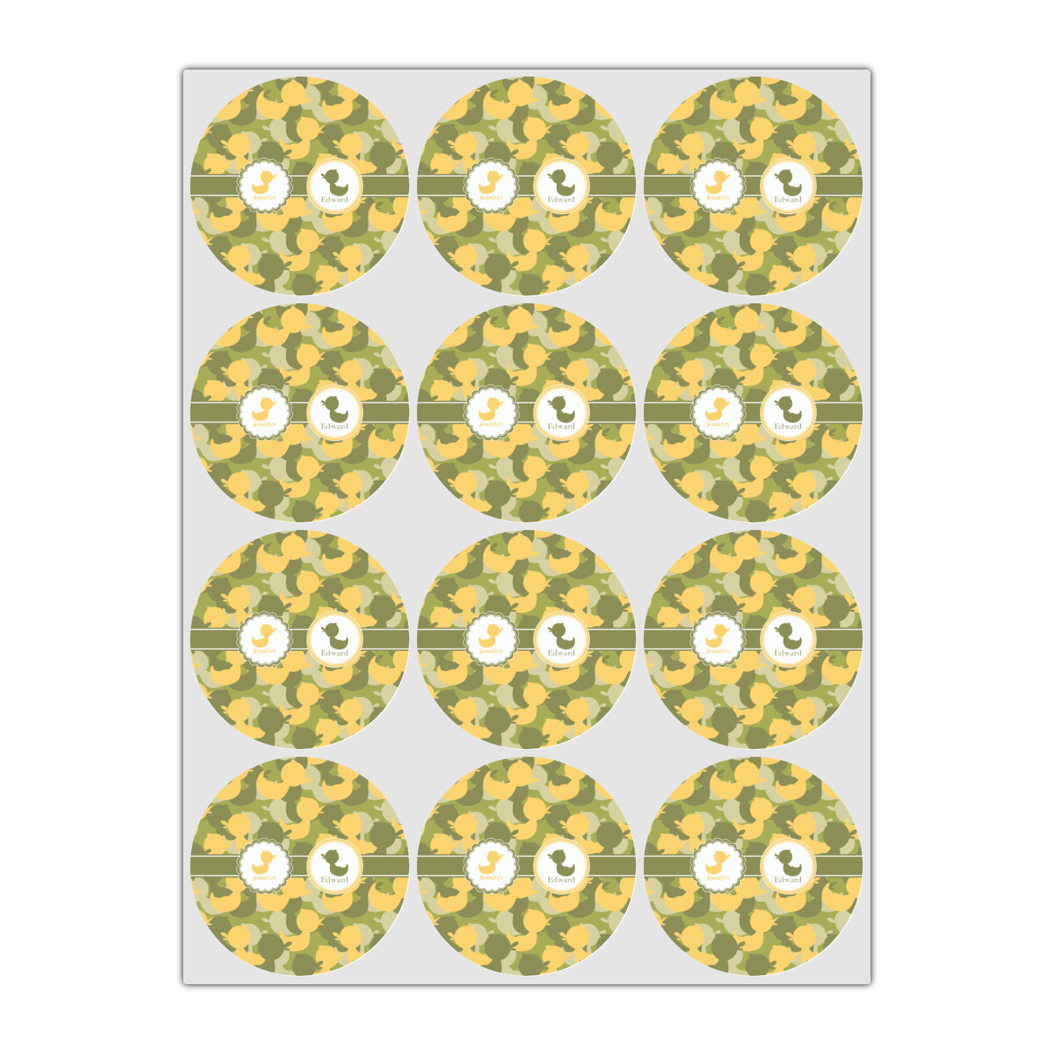 We chose to use a couples / twin personalization on our duck camo design. We used two labels - one is a girl round scalloped, while the second label is a simple round. We used the duck graphics from the camo pattern and used names below the graphics for personalization.