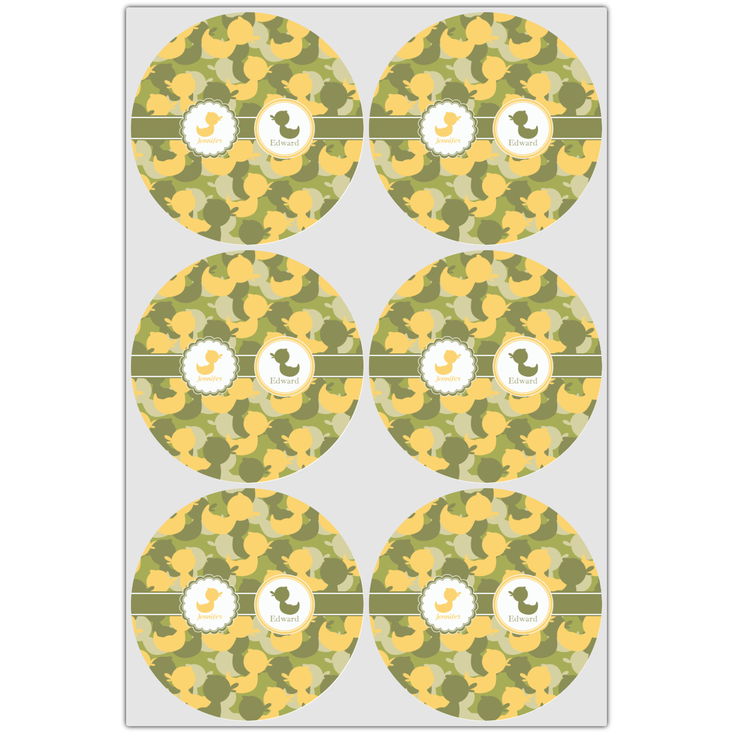 We chose to use a couples / twin personalization on our duck camo design. We used two labels - one is a girl round scalloped, while the second label is a simple round. We used the duck graphics from the camo pattern and used names below the graphics for personalization.