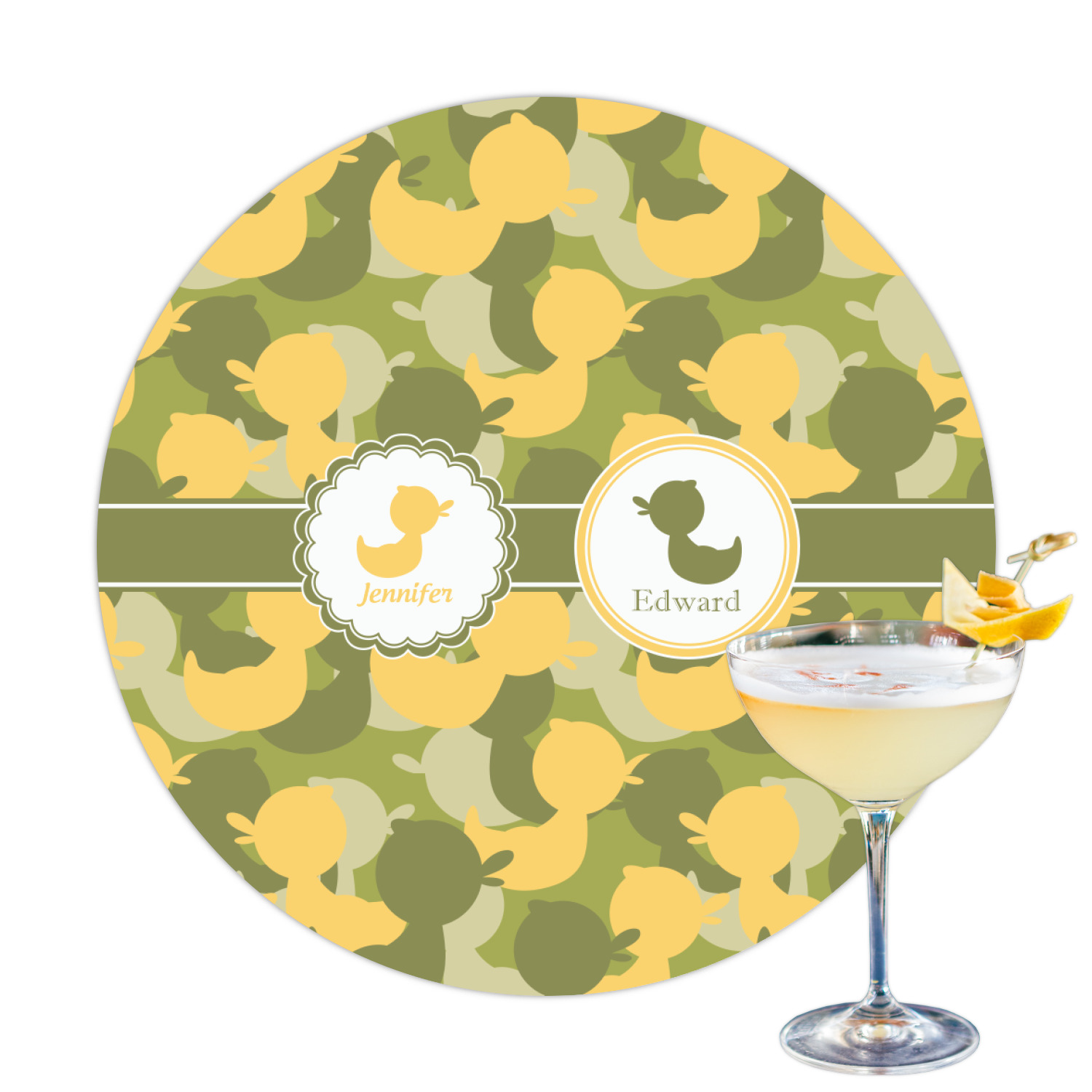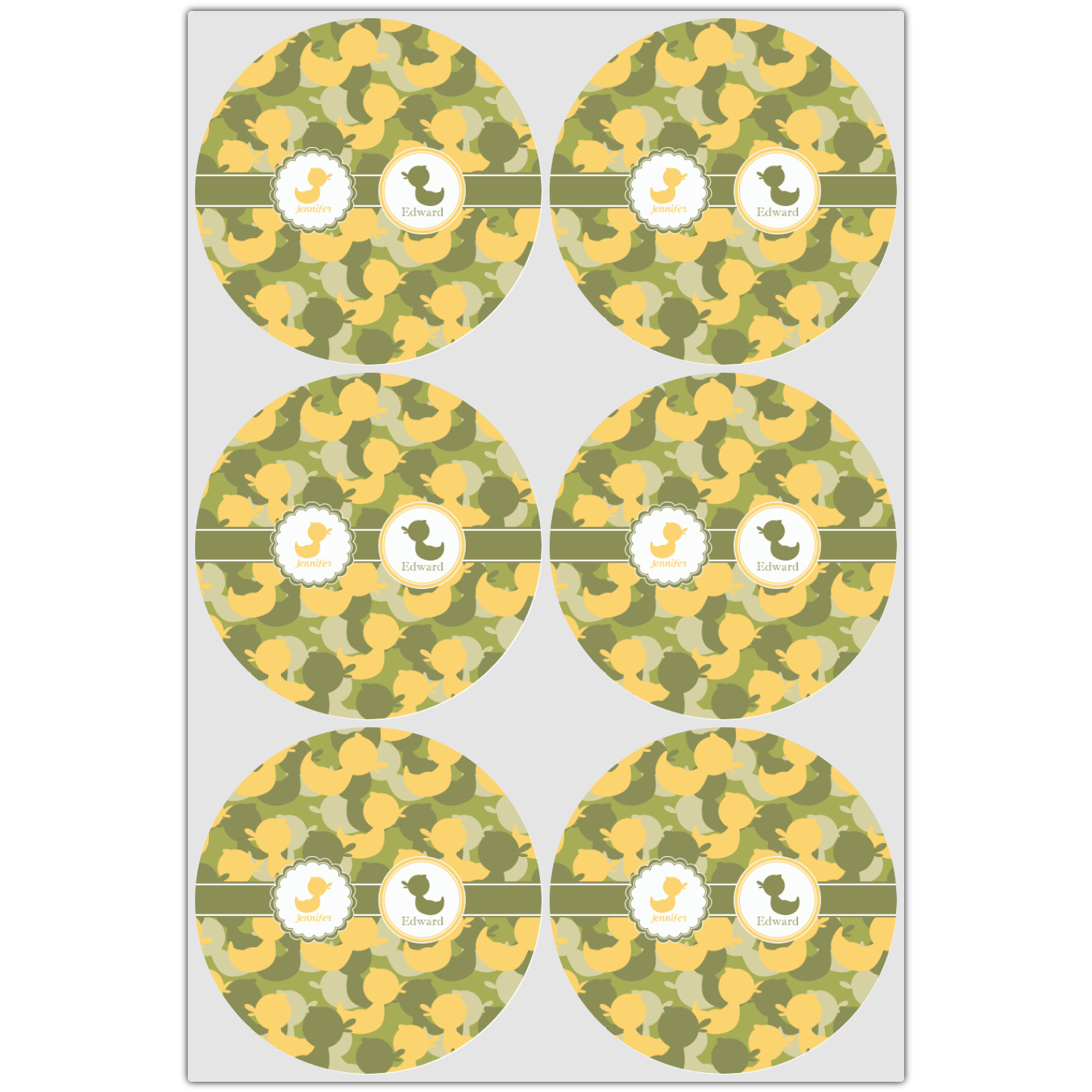 We chose to use a couples / twin personalization on our duck camo design. We used two labels - one is a girl round scalloped, while the second label is a simple round. We used the duck graphics from the camo pattern and used names below the graphics for personalization.