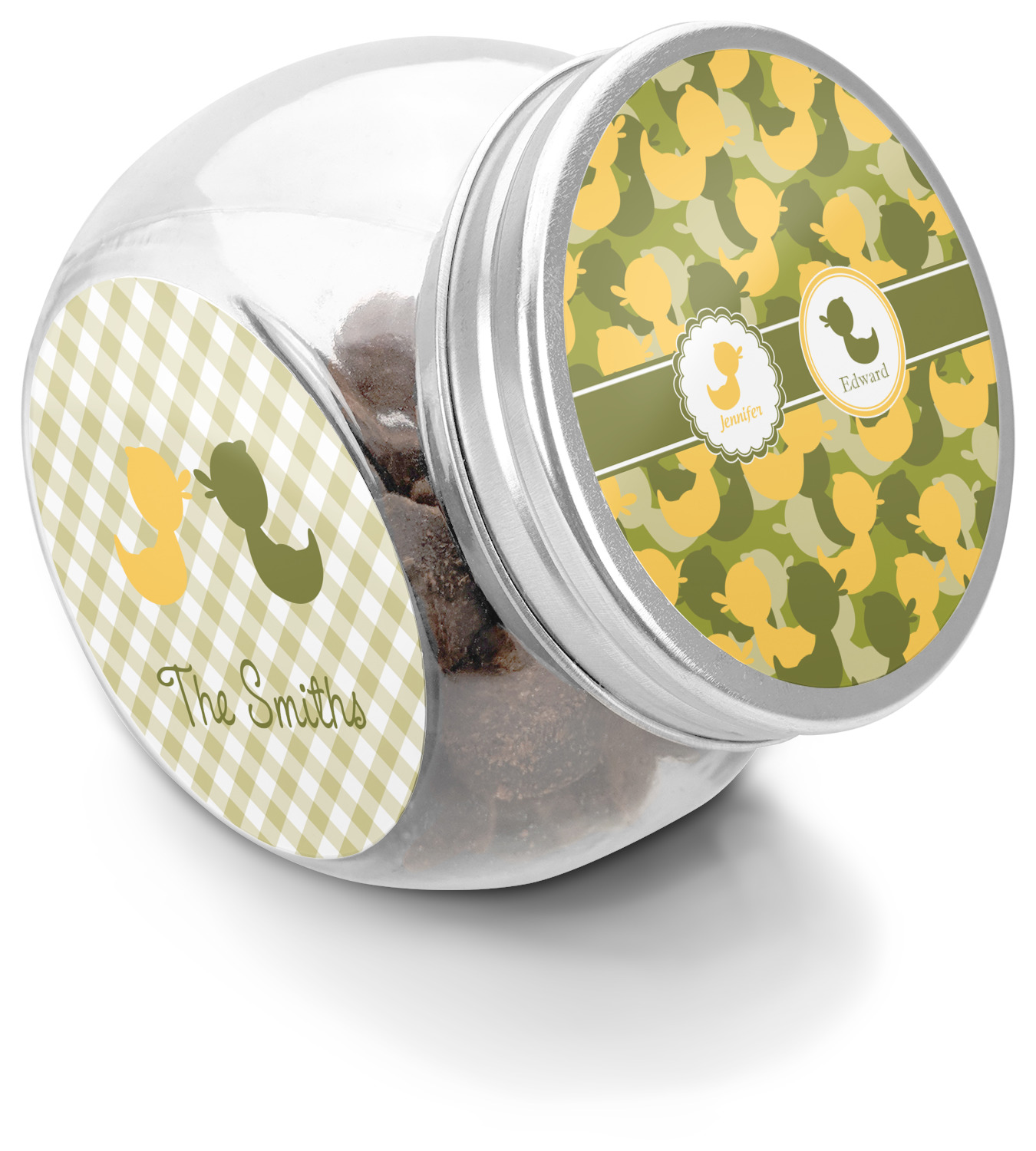 We chose to use a couples / twin personalization on our duck camo design. We used two labels - one is a girl round scalloped, while the second label is a simple round. We used the duck graphics from the camo pattern and used names below the graphics for personalization.