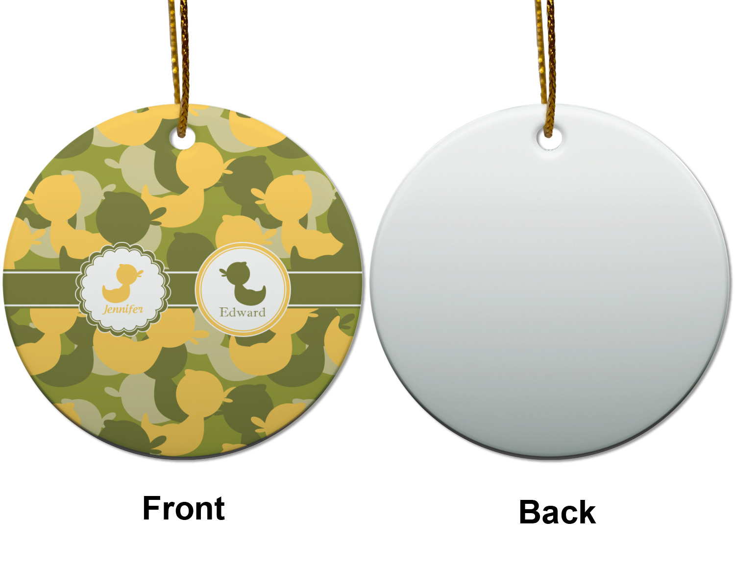 We chose to use a couples / twin personalization on our duck camo design. We used two labels - one is a girl round scalloped, while the second label is a simple round. We used the duck graphics from the camo pattern and used names below the graphics for personalization.