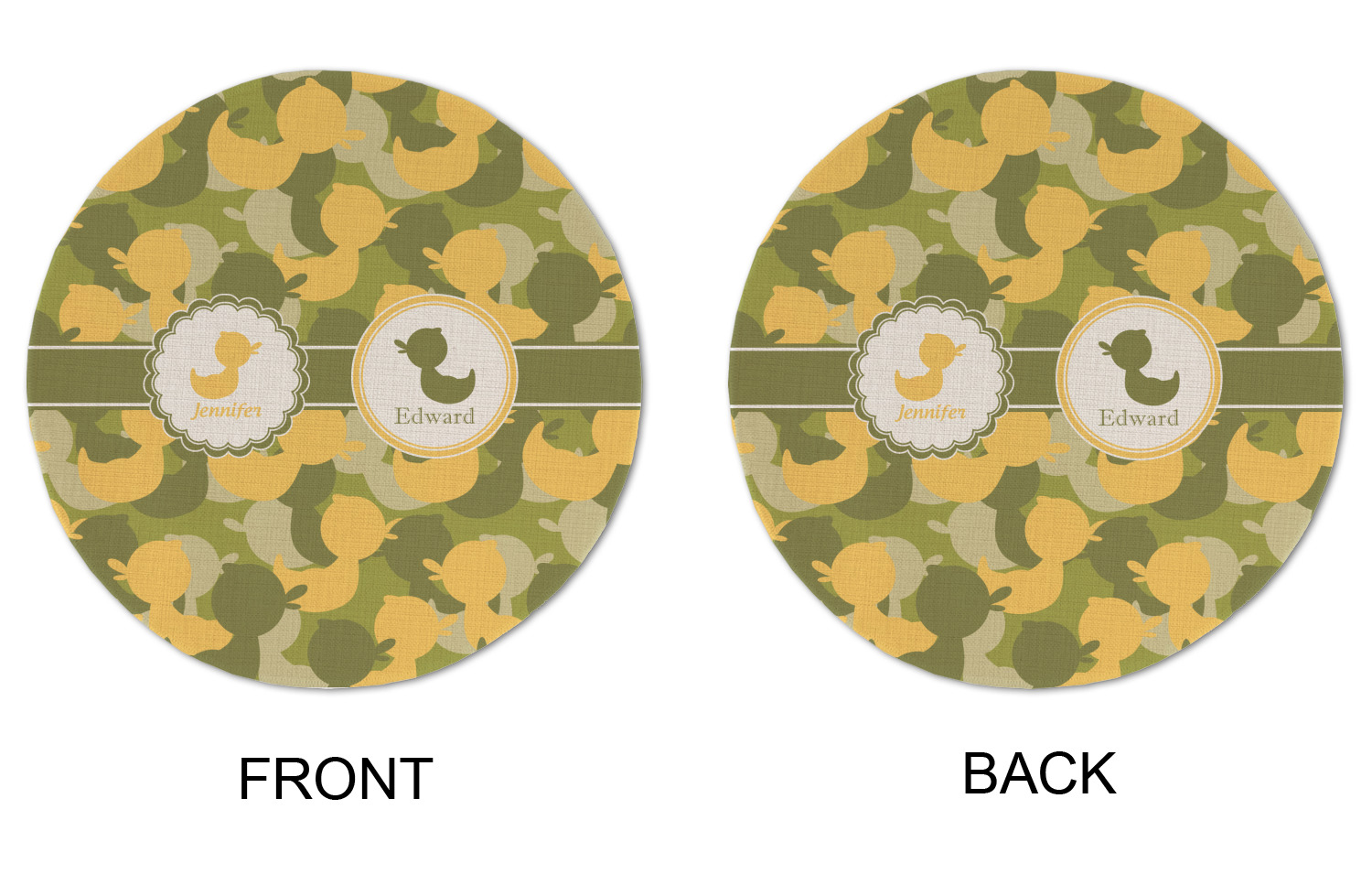 We chose to use a couples / twin personalization on our duck camo design. We used two labels - one is a girl round scalloped, while the second label is a simple round. We used the duck graphics from the camo pattern and used names below the graphics for personalization.