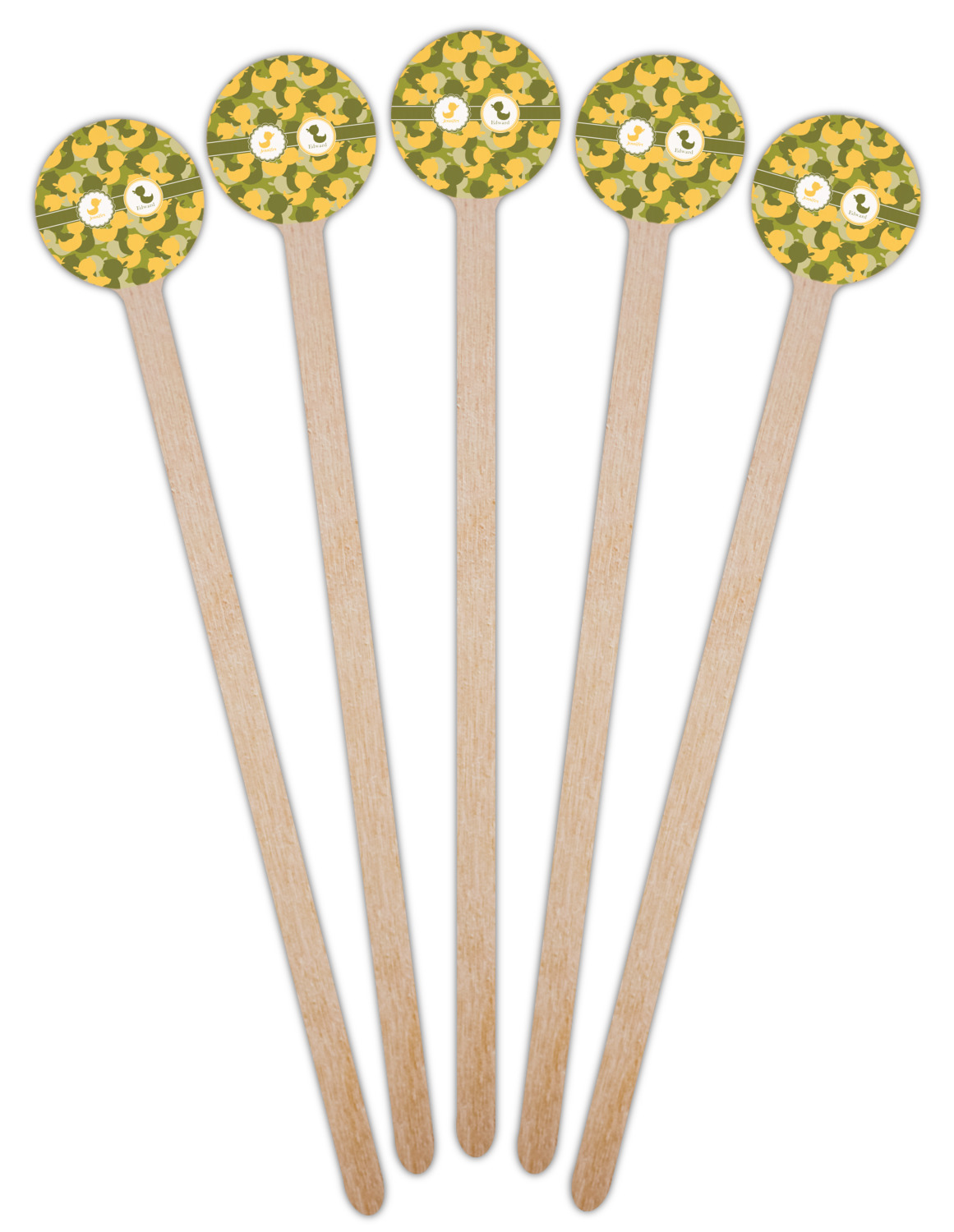 We chose to use a couples / twin personalization on our duck camo design. We used two labels - one is a girl round scalloped, while the second label is a simple round. We used the duck graphics from the camo pattern and used names below the graphics for personalization.