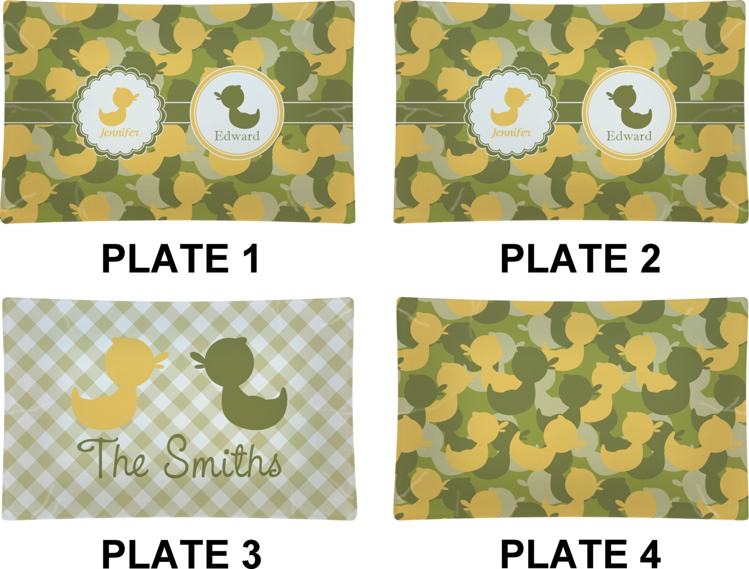 We chose to use a couples / twin personalization on our duck camo design. We used two labels - one is a girl round scalloped, while the second label is a simple round. We used the duck graphics from the camo pattern and used names below the graphics for personalization.