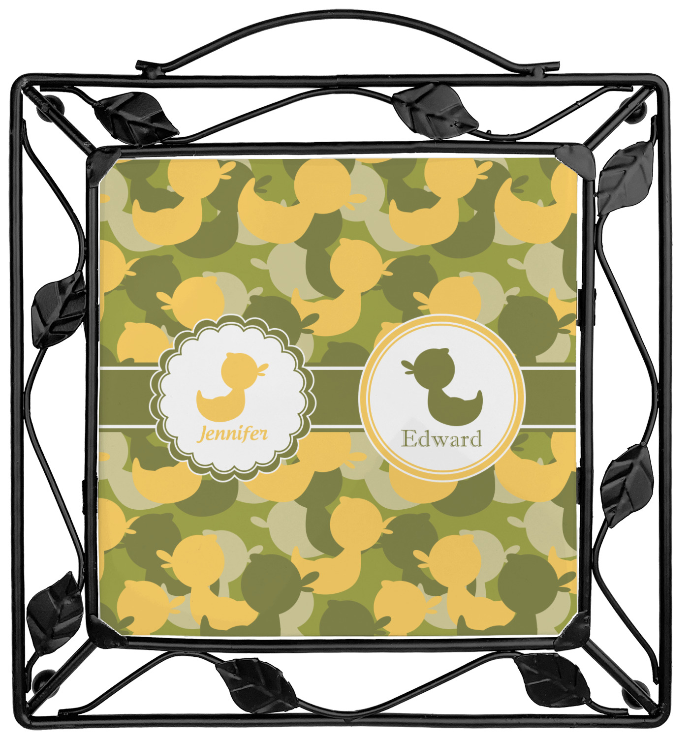 Our square trivets are made from a durable, wrought iron. This model features 4 small half circles, one on each corner, and a larger ring of iron that circles the central, customized tile. Each of the 4 corners has a round foot on its bottom for stability. This trivet is 8.75 by 8.75 inches, but the central tile measures at 6 inches on both sides.