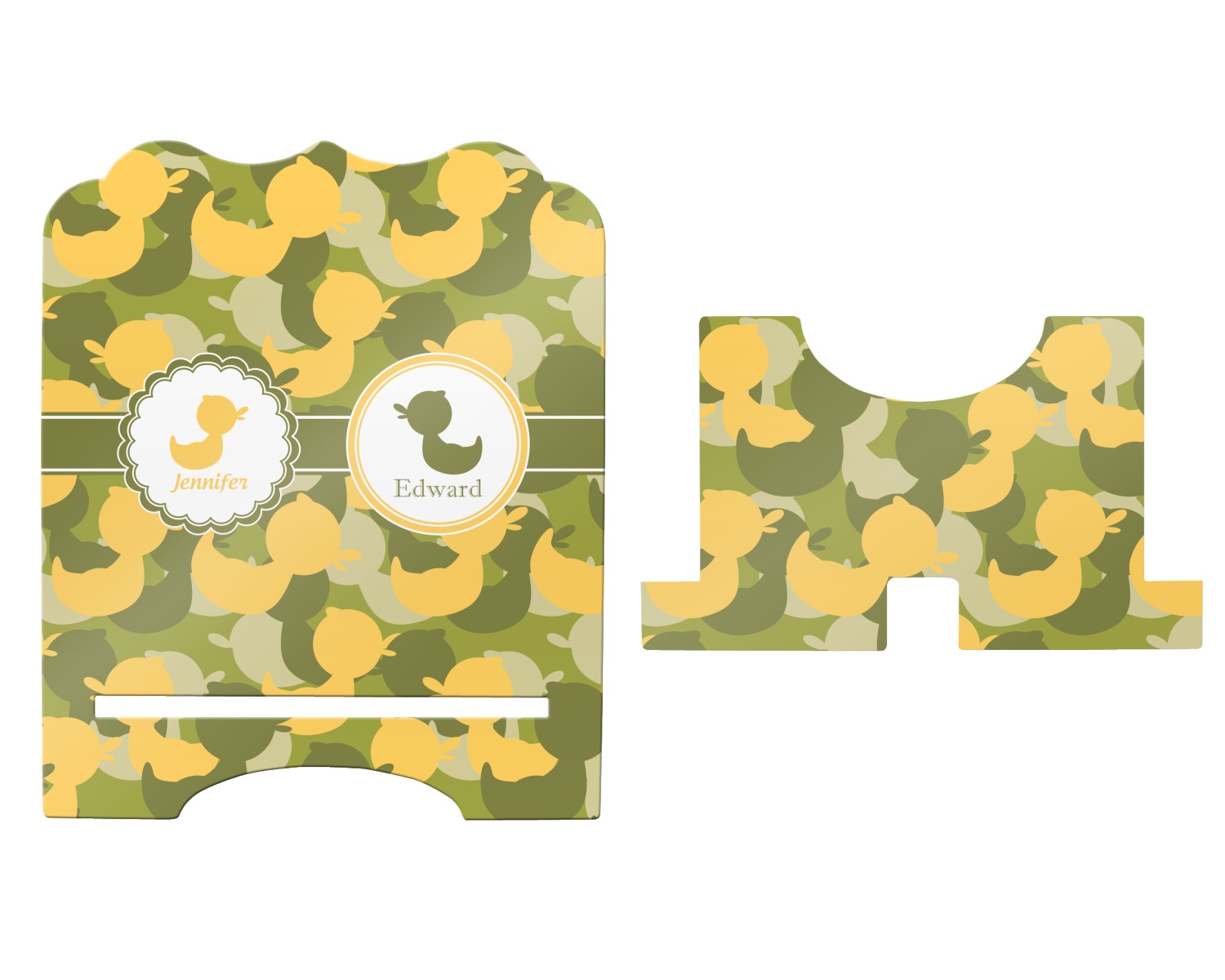 We chose to use a couples / twin personalization on our duck camo design. We used two labels - one is a girl round scalloped, while the second label is a simple round. We used the duck graphics from the camo pattern and used names below the graphics for personalization.